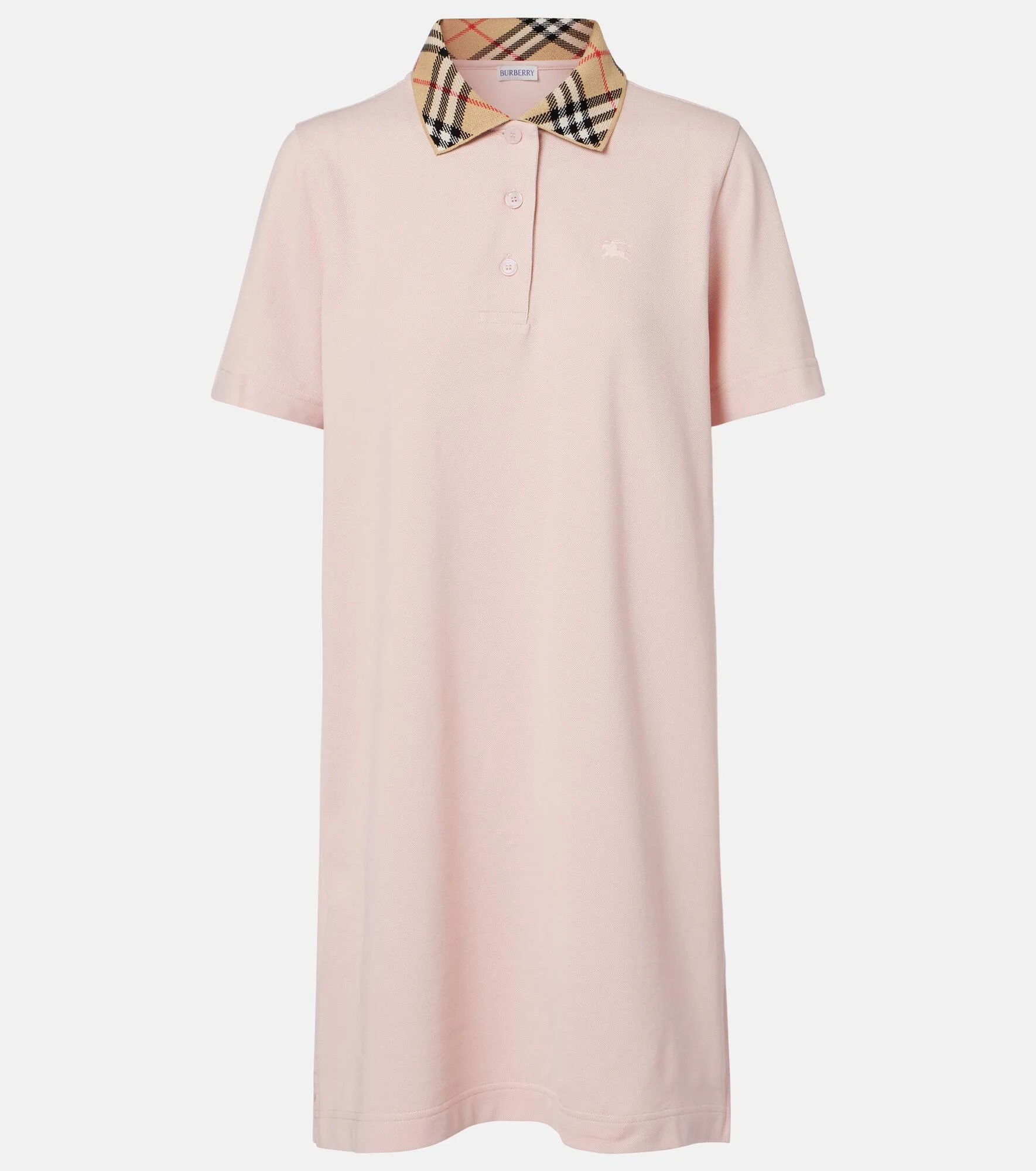 Now a house signature, the Burberry Check pattern was originally used as trench coat lining in the 1920s. The iconic motif is printed on the collar of this classic polo dress, crafted from pure, breathable cotton. Product Details - Material: 100% cotton - Care instructions: machine wash at 30 degrees - Made in Portugal - Color: pink - Designer color name: Posy Pink - Item color: pink - Details: 100% mother-of-pearl - Contains non-textile parts of animal origin - Collar: polo collar - Closure: buttoned placket - Side slits - Item number: P01143341 Size & Fit - True to size - Designed for a loose fit - Slightly stretchy fabric - The model seen in the picture is 178cm-5'10" and wearing a size XS