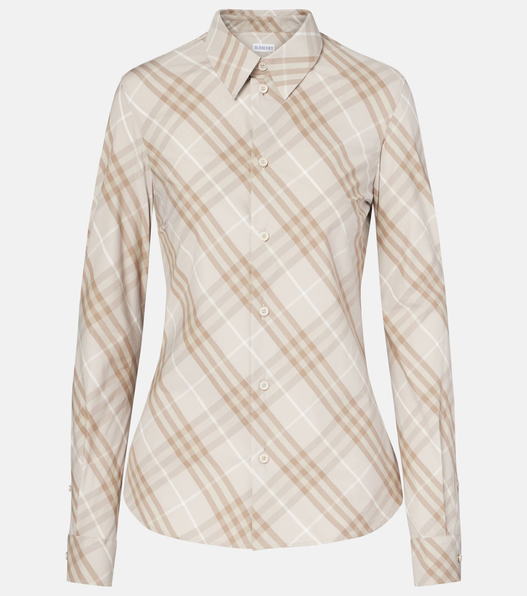Now a house signature, the Burberry Check pattern was originally used as trench coat lining in the 1920s. This cotton poplin shirt has a chic, fitted silhouette. Product Details - Material: 100% cotton - Care instructions: dry clean - Made in Tunisia - Designer color name: Stone Grey Ip Check - Item color: beige - Trim: 100% mother-of-pearl - Collar: classic (Straight point) - Cuff: buttoned - Closure: buttoned front - Contains non-textile parts of animal origin - Item number: P01101712 Size & Fit - Fits small to size - we recommend trying one size larger - Cinched waist - Non-stretchy fabric - Falls below the hip - The model seen in the picture is 178cm-5'10" and wearing a size UK 8