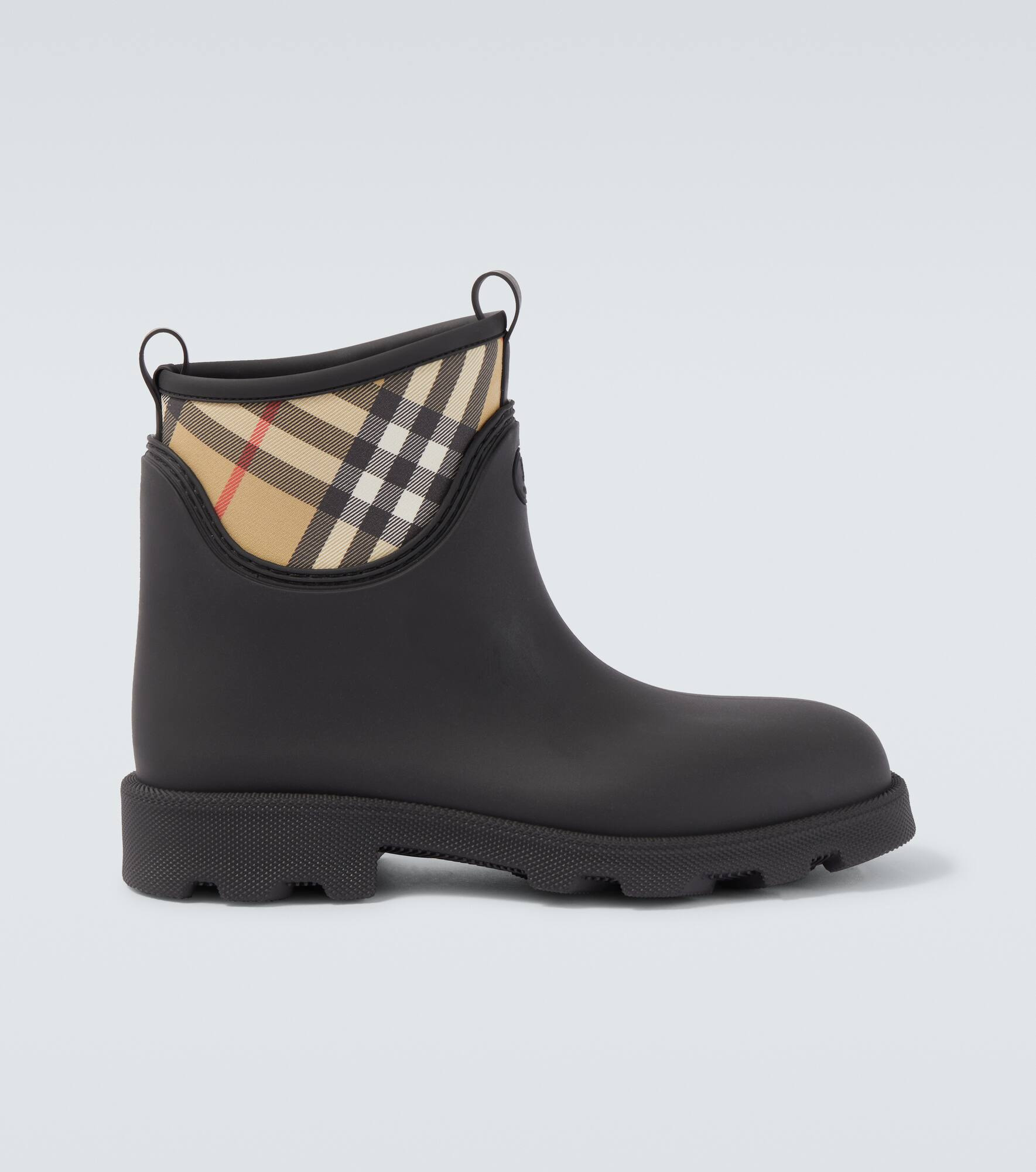 Now a house signature, the Burberry Check pattern was originally used as trench coat lining in the 1920s. These ankle rain boots feature rounded-toe silhouettes and showcase the signature pattern at the tops. Product Details - Upper: rubber - Lining: rubber - Sole: fabric insole, rubber sole - Toe shape: round toe - Made in Italy - Includes: shoe box - Designer color name: Black - Item color: black, beige - Item number: P01066758 Size & Fit - True to size - Half sizes please take the next size down - European sizes