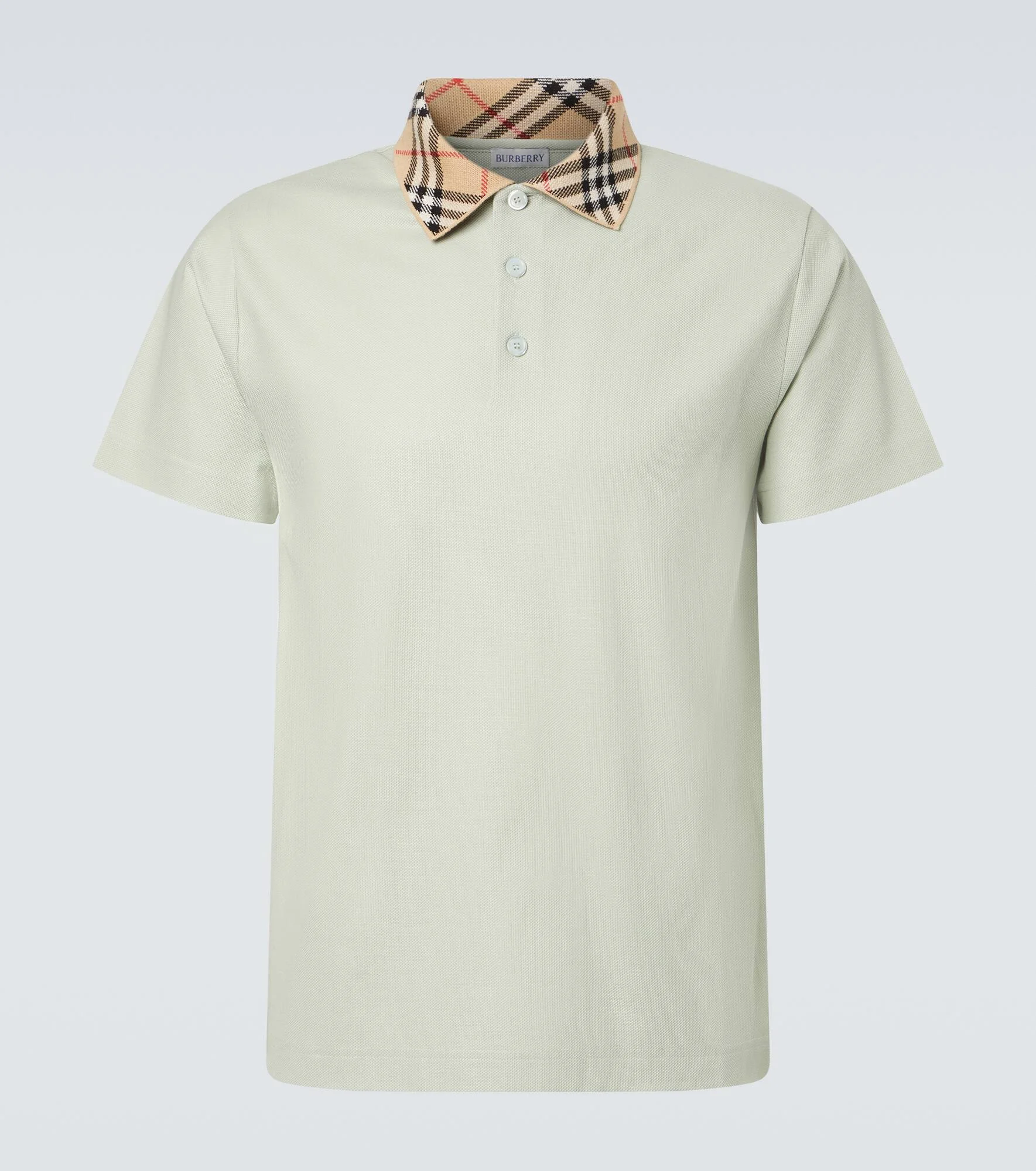 This Burberry polo shirt is cut from cotton pique to a classic silhouette. The design is complemented by the contrast Burberry Check pattern which decorates the collar, creating a signature finish. Product Details - Material: 100% cotton - Care instructions: machine wash at 30 degrees - Made in Portugal - Designer color name: Seafoam Green - Item color: green, beige - Contains non-textile parts of animal origin - Collar: polo collar - Closure: partially buttoned front - Item number: P01141300 Size & Fit - True to size - Straight fit - Non-stretchy fabric - Falls to the hip - Height of model is 189cm-74.5" and wears a size L