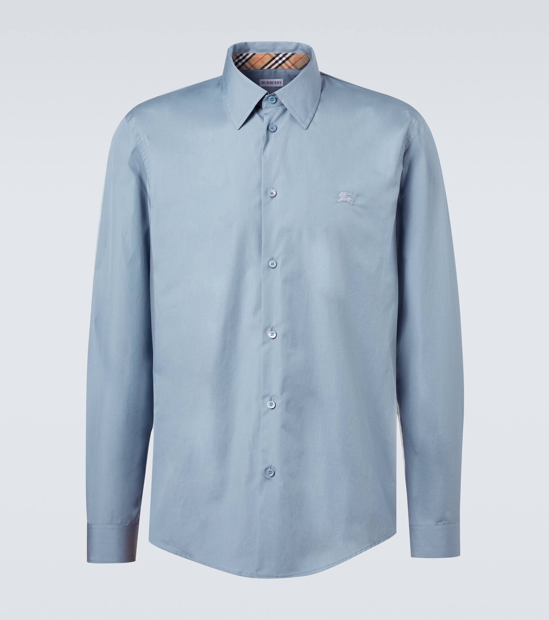 Founded in 1856, Burberry has built a reputation as a British heritage brand with unparalleled craftsmanship and groundbreaking innovation. This shirt is crafted from pure cotton and features a classic collar. Product Details - Material: 100% cotton - Care instructions: machine wash at 30 degrees - Made in Romania - Designer color name: Index - Item color: blue - Trim: 100% mother-of-pearl - Contains non-textile parts of animal origin - Dress shirt - Collar: classic (Straight point) - Item number: P01066730 Size & Fit - True to size - Without pleats in the back - Classic fit - Non-stretchy fabric - Falls below the hip - Height of model is 188cm-74" and wears a size L