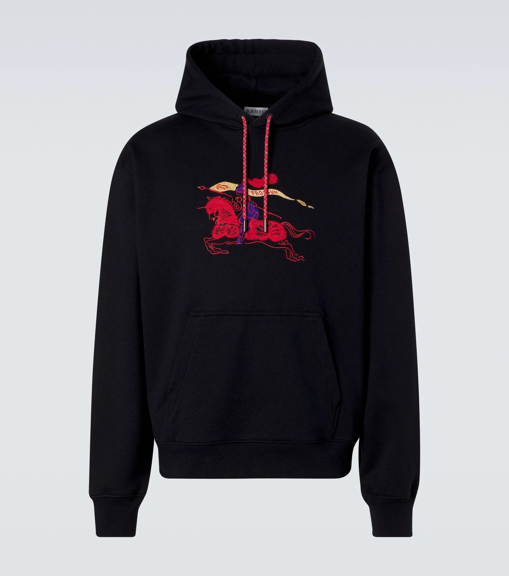 A symbol of British heritage, Burberry's Equestrian Knight Design signifies honor and the brand's commitment to always move forward. Made from pure cotton, this hoodie boasts the signature emblem at the front. Product Details - Material: 100% cotton - Care instructions: machine wash at 30 degrees - Made in Portugal - Color: blue - Designer color name: Navy - Item color: blue - Material II: 99% cotton, 1% elastane - Embroidery: 34% viscose, 25% wool, 24% acrylic, 9% polyester, 5% metallic fibres, 3% polyamide - Drawstring hood - Cuff: ribbed - Pockets: kangaroo pocket - Hem: ribbed - Item number: P01141307 Size & Fit - True to size - Dropped shoulders - Straight fit - Slightly stretchy fabric - Falls to the hip - Height of model is 189cm-74.5" and wears a size L