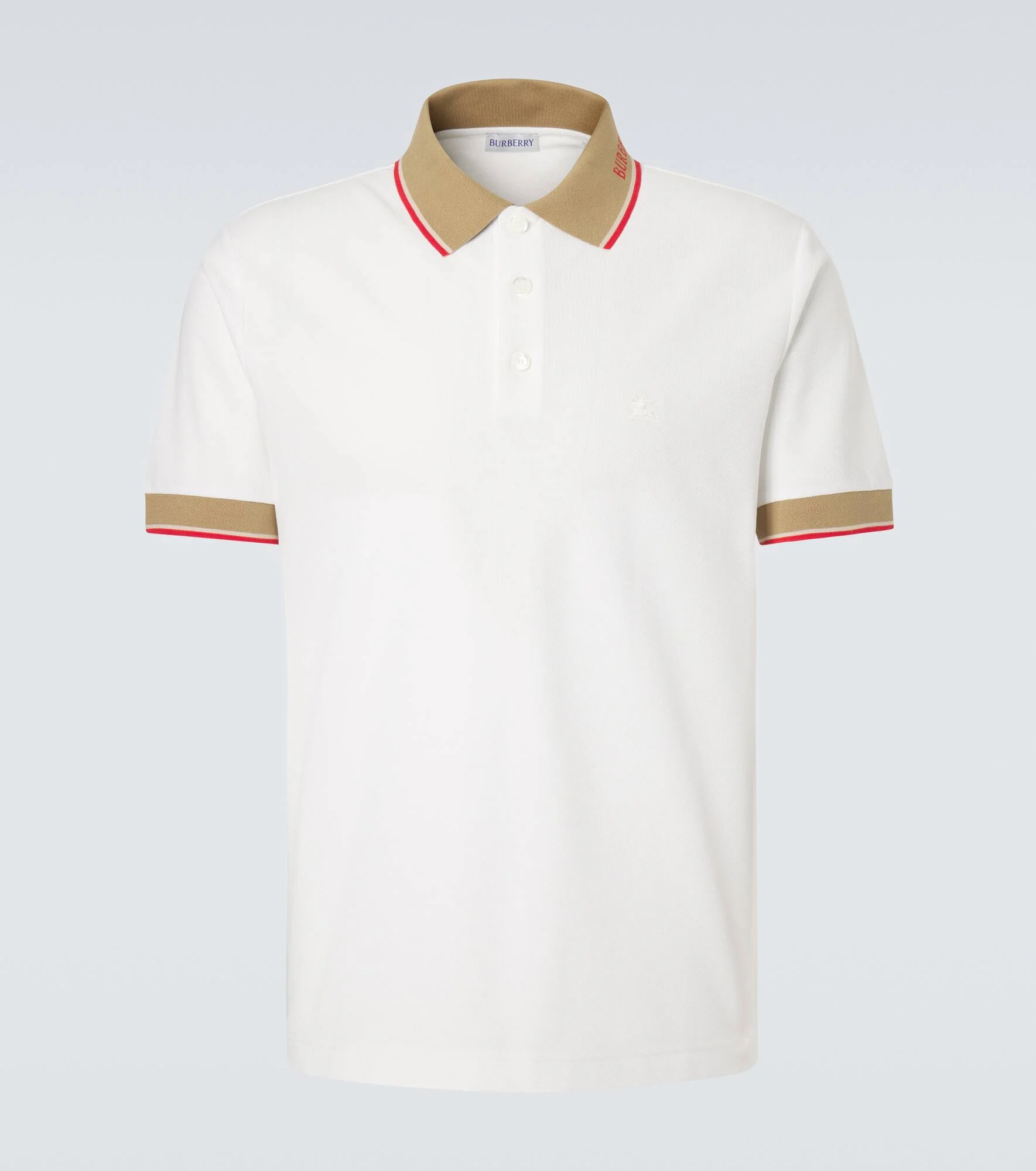 Exude timeless sophistication in the Evan polo shirt from Burberry. The piece is crafted from soft cotton into a classic straight-fit silhouette. Product Details - Material: 100% cotton - Care instructions: machine wash at 30 degrees - Made in Portugal - Color: white - Designer color name: Chalk - Details: 78% cotton, 18% polyamide, 4% elastane - Insert: 100% mother-of-pearl - Contains non-textile parts of animal origin - Collar: polo collar - Closure: partially buttoned front - Item number: P01171037 Size & Fit - True to size - Straight fit - Non-stretchy fabric - Falls to the hip - Height of model is 192cm-75.5" and wears a size L