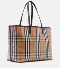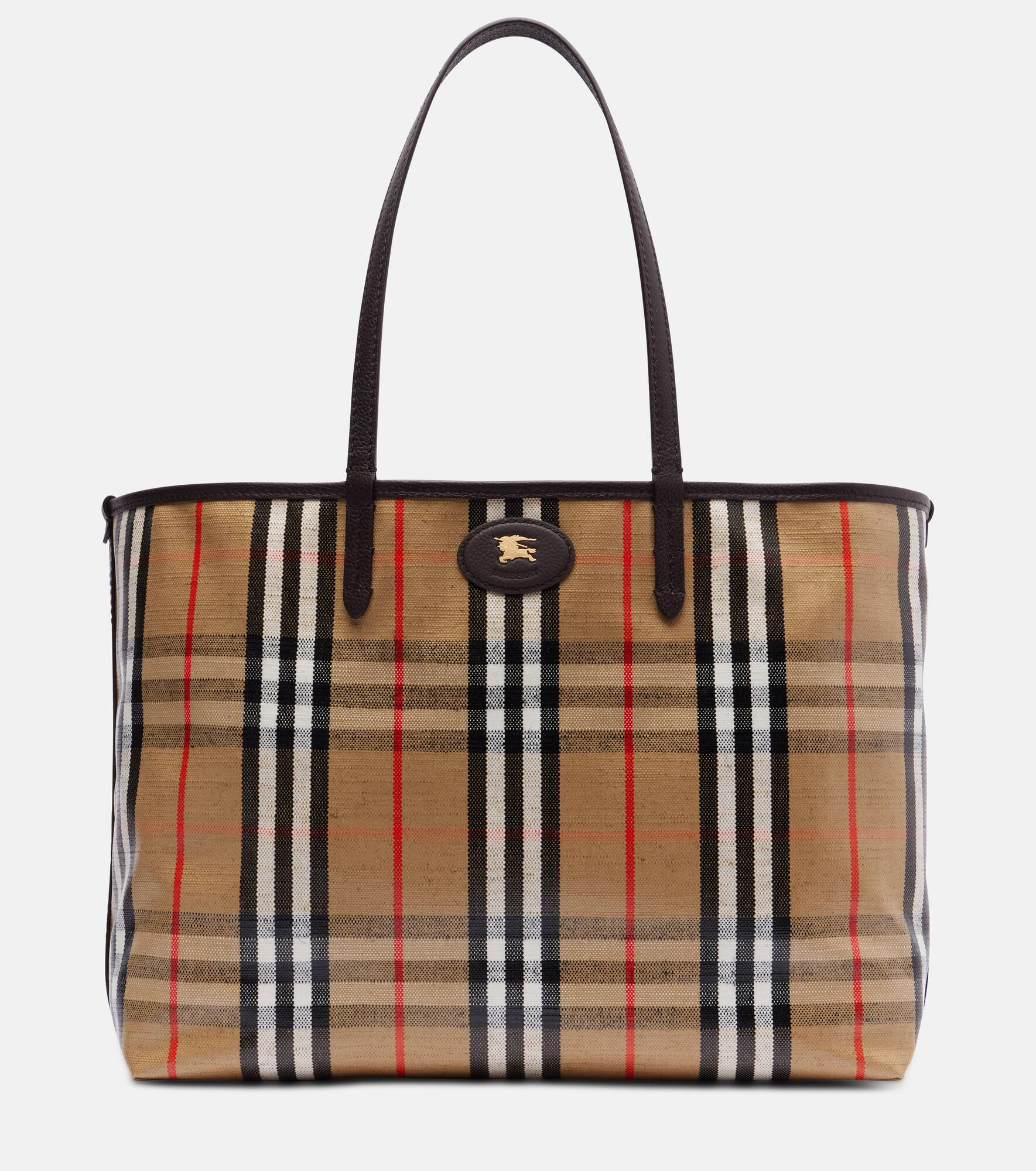 The Highlands Medium tote bag by Burberry is crafted in Italy, featuring the signature Burberry Check jacquard. This stylish accessory boasts leather trims and handles and the brand’s Knit stamp at the front. Product Details - Material: cotton, viscose, linen - Lining: cotton - Made in Italy - Designer color name: Sand - Item color: beige, brown - Trim: calf leather - Closure: snap-buttoned fastening - Detachable pouch - Top handles - Item number: P01068234 Size & Fit - Height 29cm-11.5" - Width 40cm-15.5" - Depth 16cm-6.5" - Length of handles 55cm-21.5"