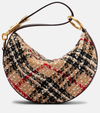 The Knight Arc shoulder bag from Burberry is crafted from boucle with a leather top handle and showcases the distinctive motif. Now a house signature, the Burberry Check pattern was originally used as trench coat lining in the 1920s. Product Details - Material: fabric - Lining: calf leather - Made in Italy - Designer color name: Sand - Item color: beige, multicolor - Trim: calf leather - Hardware color: gold - Top handle - Internal details: single compartment - Closure: zipped top - Includes: dust bag - Item number: P01100322 Size & Fit - Height 19cm-7.5" - Width 28cm-11" - Depth 7cm-3" - Length shoulder strap 46cm-18"