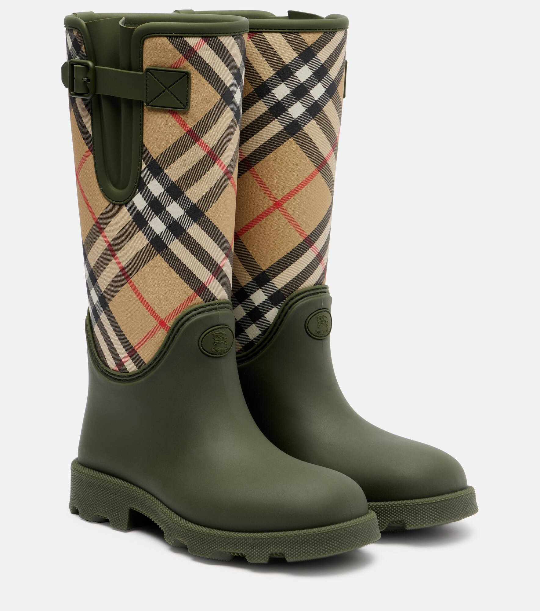 Now a house signature, the Burberry Check pattern was originally used as trench coat lining in the 1920s. The Marsh rain boots feature rounded-toe silhouettes with buckle fastenings and the signature pattern all-over. Product Details - Upper: rubber - Lining: rubber - Sole: rubber insole and sole - Toe shape: round toe - Made in Italy - Includes: shoe box - Designer color name: Loch - Item color: green, beige - Closure: buckle fastening - Item number: P01064139 Size & Fit - True to size - European sizes - 2cm-1" platform (size EU 38) - 4cm-1.5" wedge heel (size EU 38) - 36,5cm-14.5" shaft height (size EU 38) - 32,5cm-13" shaft width (size EU 38) - shaft width measured on largest part of boot