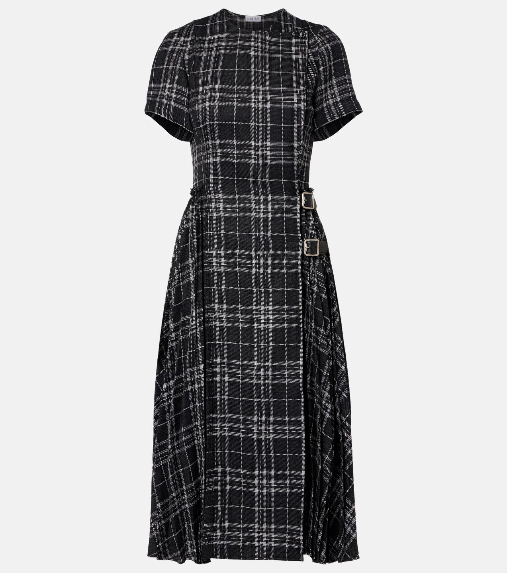 Founded in 1856, Burberry has built a reputation as a British heritage brand with unparalleled craftsmanship and groundbreaking innovation. The Meryl midi dress features an allover check motif, a double belt on the waist, and a pleated skirt. Product Details - Material: 55% polyester, 45% wool - Care instructions: dry clean - Made in Romania - Designer color name: Onyx Grey/Lt Grey Ck - Item color: gray, black - Lining: 100% cotton - Trim: 100% leather - Contains non-textile parts of animal origin - Closure: buckle fastening, buttoned front - Short vent - Item number: P01101710 Size & Fit - Fits small to size - we recommend trying one size larger - Cinched waist - Non-stretchy fabric - The model seen in the picture is 178cm-5'10" and wearing a size UK 8