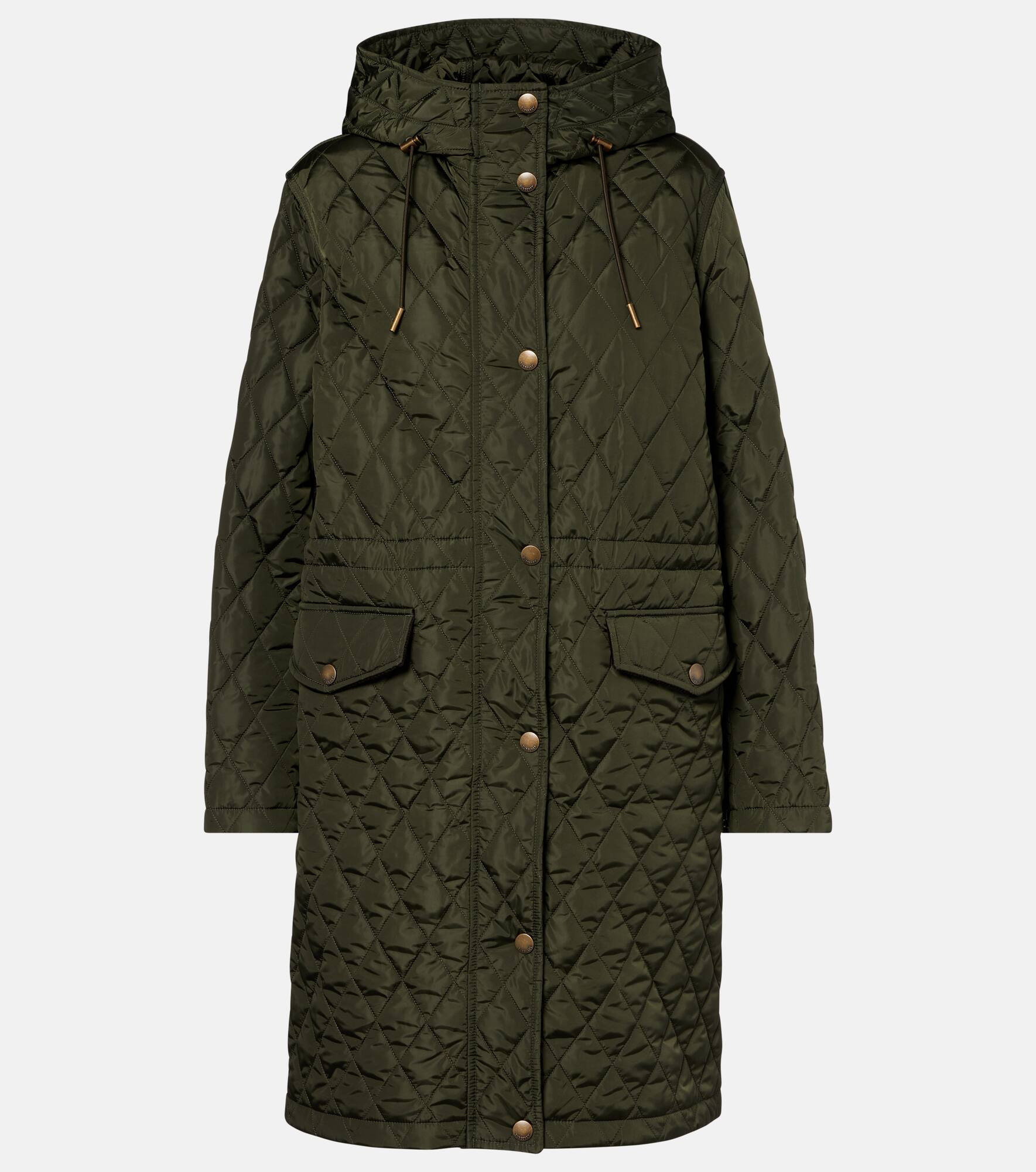Burberry has built a reputation as a British heritage brand with unparalleled craftsmanship. Woven from lightweight fabric, this quilted jacket features a drawstring hood, flap pockets and a zip with snap-button closure. Product Details - Material: 100% polyamide - Care instructions: dry clean - Made in Romania - Designer color name: Shale - Item color: green - Lining: 100% cotton - Hood: 100% polyamide - Filling: 100% polyester - Closure: two-way zipped front with snap-button fastenings - Drawstring hood - Drawstring waist - Pockets: flap pockets, internal pocket - Item number: P01067137 Size & Fit - True to size - Loose fit, drawstring waist - Non-stretchy fabric - Falls below the hip - The model seen in the picture is 178cm-5'10" and wearing a size XS