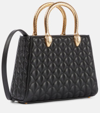Exuding exquisite craftsmanship and sophisticated appeal, Bvlgari's Serpentine Duo leather tote bag showcases quilting inspired by the mosaics of the Baths of Caracalla. Note the jewelry-inspired top handles, evoking the serpent's sinuous movements. Product Details - Material: calf leather - Lining: leather (nappa) - Made in Italy - Designer color name: Black - Internal details: single compartment, internal zipped pocket, internal slot pocket - Top handles, Detachable, adjustable shoulder strap - Closure: open top - Hardware color: gold - Item number: P01031995 Size & Fit - Height 15,5cm-6" - Min. width 17,5cm-7" - Max. width 21,5cm-8.5" - Depth 4,5cm-2" - Length of handles 21cm-8.5" - Adjustable shoulder strap - Min. length shoulder strap 109cm-43" - Max. length shoulder strap 124cm-49"