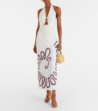 At Cala de la Cruz, vintage-inspired silhouettes and modern sophistication intersect to create striking designs. Crafted from pure linen, the Clara maxi dress features a center cutout, spiral hardware at the halter neckline, and an eye-catching print. Product Details - Material: 100% linen - Care instructions: dry clean - Made in Colombia - Color: white - Designer color name: Namurceleste - Item color: white - Lining: 100% cotton - Closure: concealed zipped back - Item number: P01122120 Size & Fit - Fits small to size - we recommend trying one size larger - Low back - Cinched waist - Non-stretchy fabric - The model seen in the picture is 178cm-5'10" and wearing a size S