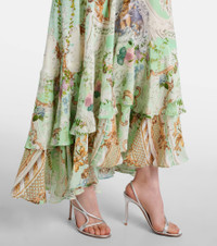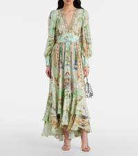 Maximalists adore Camilla's unique aesthetic of hand-drawn prints and precisely placed crystal embellishments. Handcrafted from silk, this maxi dress features a V-neckline as well as a ruffled hem and tapered blouson sleeves. Product Details - Material: 100% silk - Care instructions: dry clean - Made in India - Designer color name: Pestana Panorama - Item color: green - Item number: P01041702 Size & Fit - True to size - Cinched waist - Elasticated waist - The model seen in the picture is 178cm-5'10" and wearing a size XS