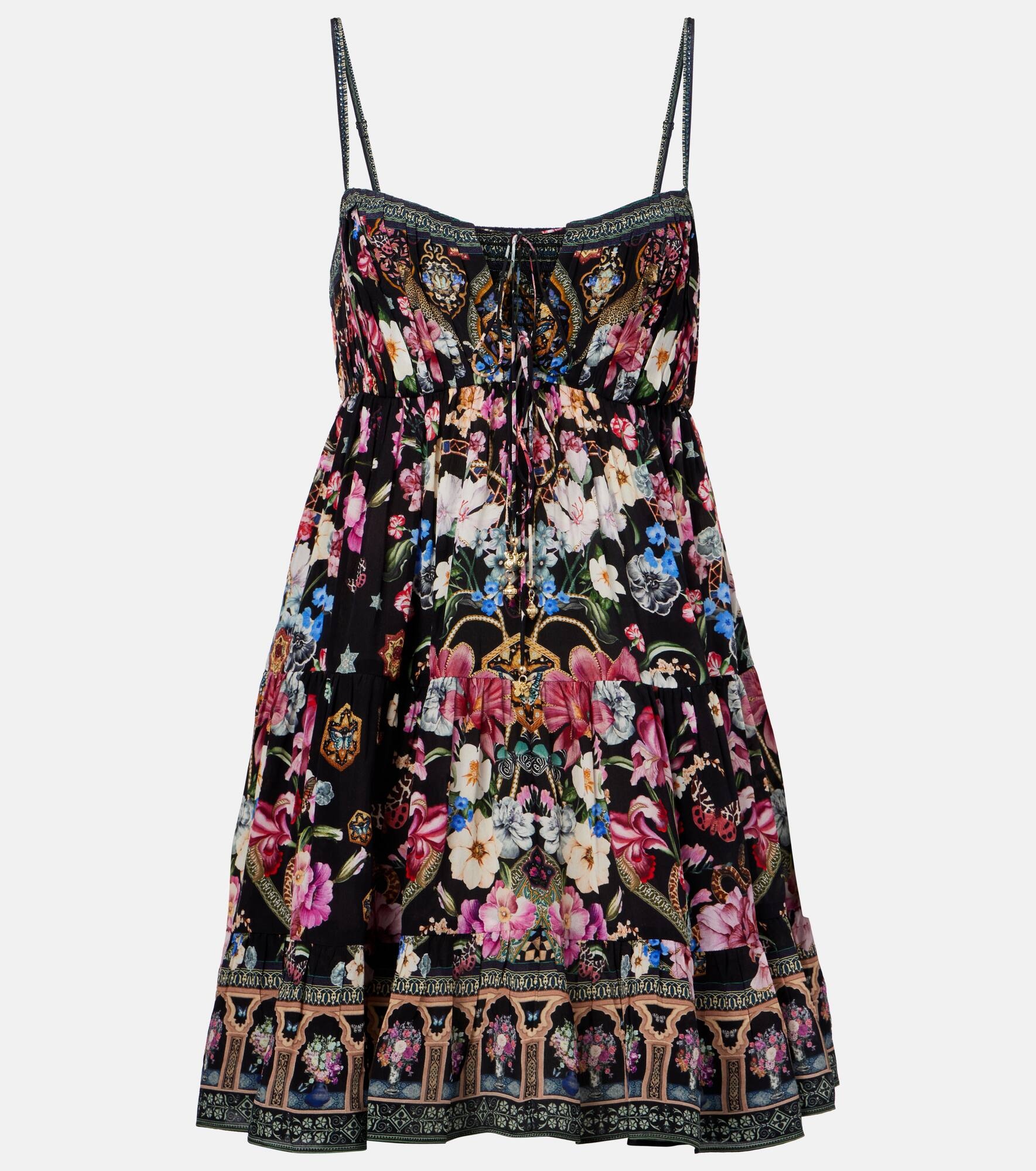 Maximalists adore Camilla's unique aesthetic of hand-drawn prints and precisely placed crystal embellishments. Handcrafted from silk, this minidress features a gathered bustline with tie-detail and a tiered skirt. Product Details - Material: 100% silk - Care instructions: dry clean - Made in India - Designer color name: Midnight In Monserrate - Item color: black, multicolor - Adjustable shoulder straps - Item number: P01051398 Size & Fit - True to size - Cinched waist - Non-stretchy fabric - The model seen in the picture is 178cm-5'10" and wearing a size XS