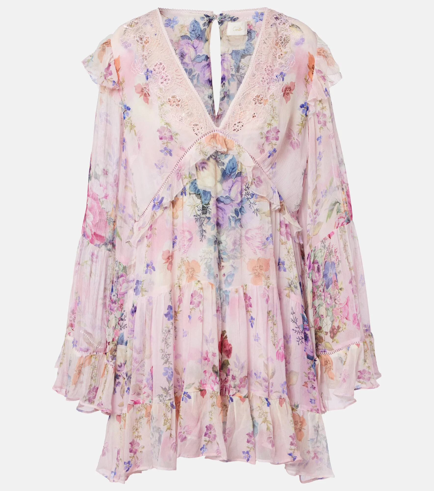Maximalists adore Camilla's hand-drawn prints and precisely placed embellishments. Made from silk chiffon with lace trims along the V-neckline, this minidress flaunts a tiered silhouette with a colorful floral motif and shimmering crystals. Product Details - Material: 100% silk - Care instructions: dry clean - Made in India - Designer color name: Palatial Pastels - Item color: pink, multicolor - Lining: 100% silk - Collar: V-neck - Closure: buttoned back - Item number: P01121079 Size & Fit - True to size - Designed for a loose fit - Non-stretchy fabric - The model seen in the picture is 178cm-5'10" and wearing a size XS