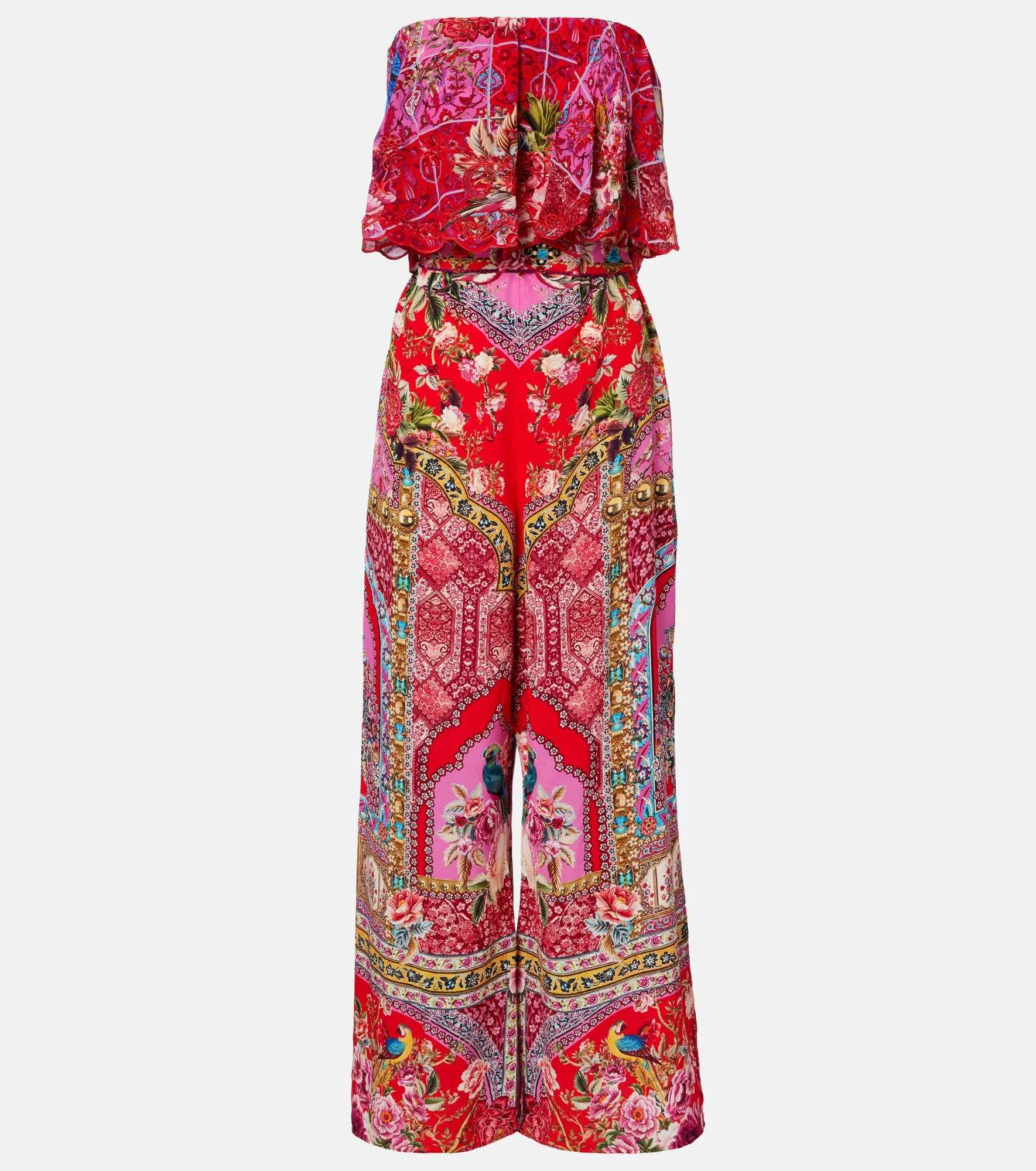 Handcrafted from silk crepe, this jumpsuit from Camilla is tailored to a streamlined silhouette with a colorful print. The style features a strapless bodice, a detachable belt, and subtle crystal embellishments for a shimmering finish. Product Details - Material: 100% silk - Care instructions: dry clean - Made in India - Designer color name: Heirloom Empire - Item color: multicolor - Pockets: side slit pockets - Detachable belt - Item number: P01121106 Size & Fit - True to size - Strapless - Loose fit, comes with belt - Wide-leg - The model seen in the picture is 178cm-5'10" and wearing a size XS