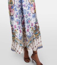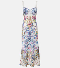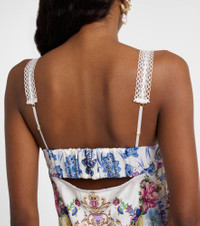 This midi dress from Camilla brings a cheerful energy to the function with its colorful floral print. Crafted from lustrous silk satin, the garment is designed with a gathered bodice, lace-trimmed shoulder straps, and a self-tie front. Product Details - Material: 100% silk - Care instructions: dry clean - Made in China - Designer color name: All About That Lace - Item color: white, multicolor - Trim: 100% polyester - Closure: self-ties - Adjustable shoulder straps - Item number: P01121099 Size & Fit - Fits large to size - we recommend trying one size smaller - Low back - Elasticated top - Cinched waist - Non-stretchy fabric - The model seen in the picture is 178cm-5'10" and wearing a size XXS
