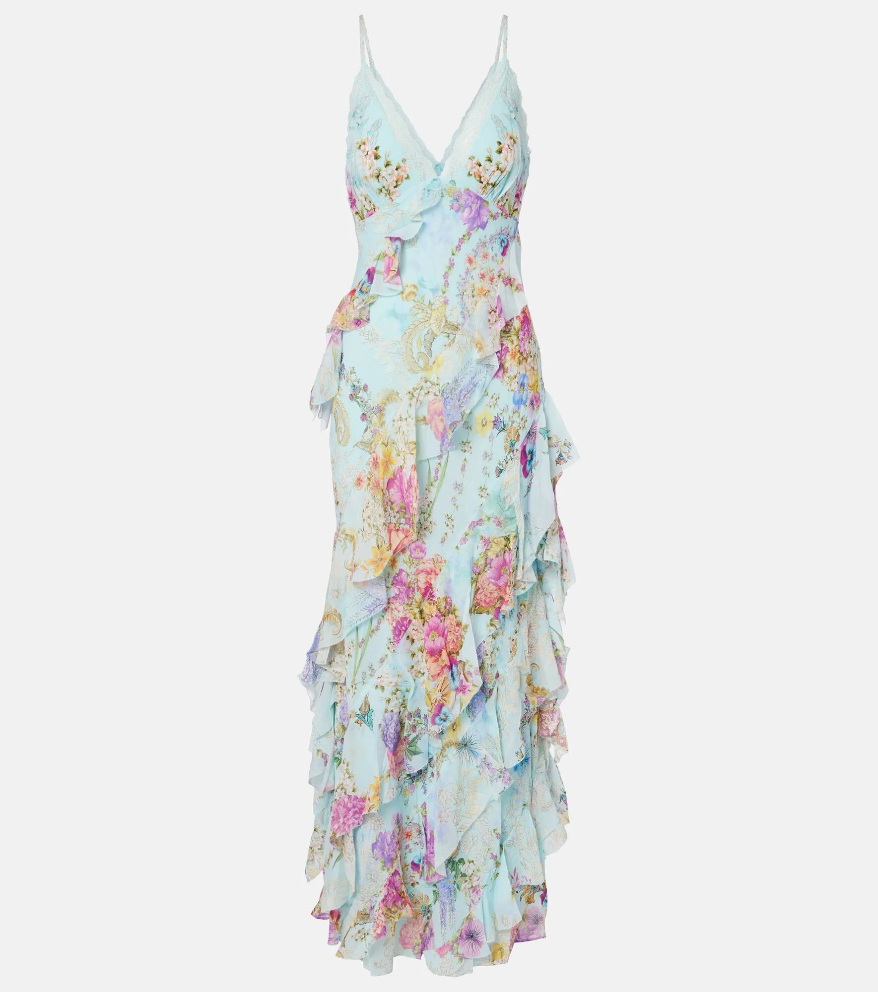 Maximalists adore Camilla's hand-drawn prints and precisely placed embellishments. This silk slip dress is designed with all-over ruffling and flaunts a lace-trimmed V-neckline and a colorful floral motif. Product Details - Material: 100% silk - Care instructions: dry clean - Made in China - Designer color name: Bazaar Bloms - Item color: blue, multicolor - Lining: 100% viscose - Collar: V-neck - Adjustable shoulder straps - Item number: P01121103 Size & Fit - True to size - Low back - Fitted - Non-stretchy fabric - The model seen in the picture is 178cm-5'10" and wearing a size XS