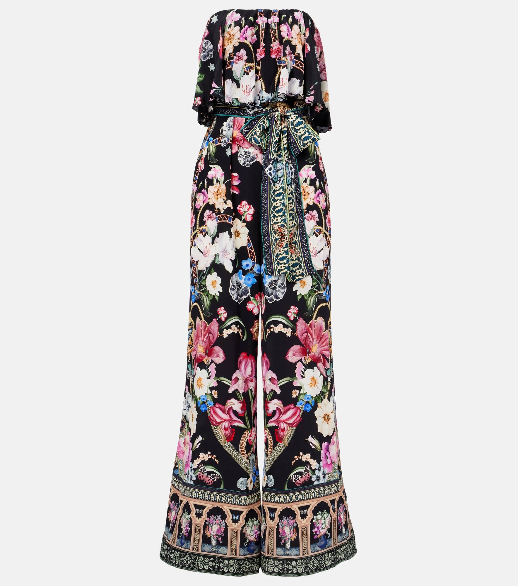 The Midnight in Monserrate jumpsuit from Camilla is made from pure silk and features a playful and bold signature print. With a cinched waist, strapless neckline, and detachable belt, it combines elegance with a relaxed, effortless silhouette. Product Details - Material: 100% silk - Care instructions: dry clean - Made in India - Designer color name: Midnight In Monserrate - Item color: multicolor, black - Pockets: side slit pockets - Item number: P01051431 Size & Fit - True to size - Strapless - Straight fit - Non-stretchy fabric - Wide-leg - The model seen in the picture is 178cm-5'10" and wearing a size XS