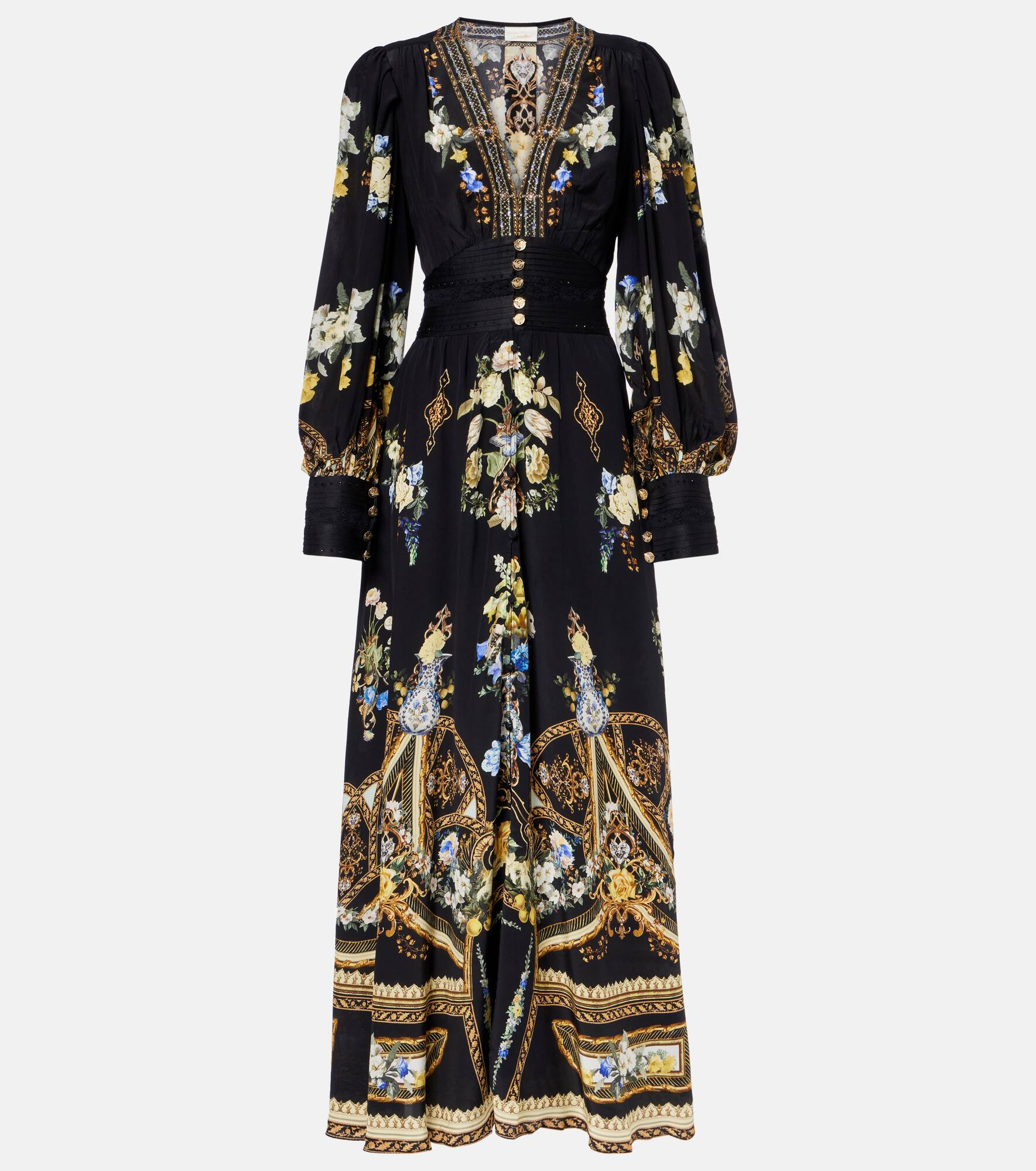 The Ottoman Elegance maxi dress from Camilla is a handcrafted silk silhouette, with a floral print by in-house artisans. This style features a shaped waistband, V-neckline, shirred back, and softly gathered sleeves with delicate frills. Product Details - Material: 100% silk - Care instructions: dry clean - Made in India - Designer color name: Ottoman Elegance - Item color: black, multicolor - Material II: 100% silk - Material III: 100% silk - Collar: V-neck - Closure: hook-fastening front, partially buttoned front - Hardware color: gold - Cuff: four buttons - Pockets: side slit pockets - Short vent - Item number: P01093348 Size & Fit - True to size - Loose fit, elasticated waist - Non-stretchy fabric - The model seen in the picture is 178cm-5'10" and wearing a size XS