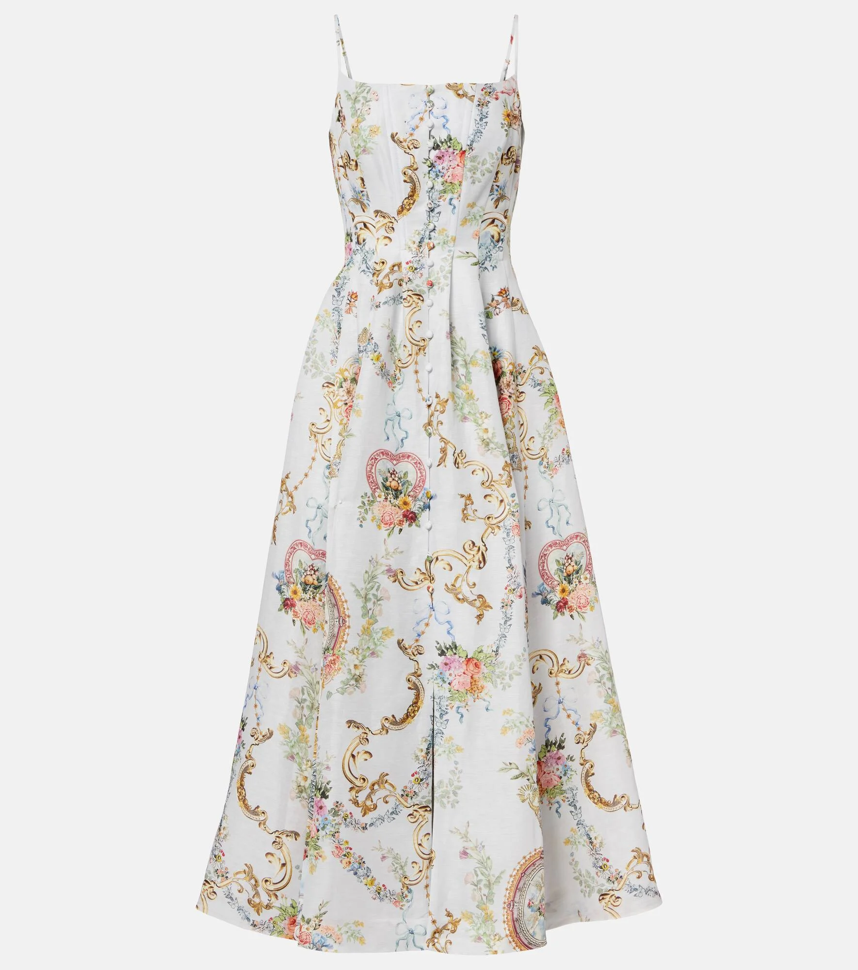 Maximalists adore Camilla's unique aesthetic of hand-drawn prints and precisely placed crystal embellishments. This linen and silk midi dress is shaped into a sculpting fit-and-flare silhouette with a bustier bodice and A-line skirt. Product Details - Material: 82% linen, 18% silk - Care instructions: dry clean - Made in China - Color: multicoloured - Designer color name: Seville Sweetheart - Lining: 100% cotton - Details: 100% silk - Closure: buttoned front, concealed zipped back - Adjustable shoulder straps - Boning - Item number: P01161943 Size & Fit - Fits large to size - we recommend trying one size smaller - Internal boned corset for support - Cinched waist - Non-stretchy fabric - The model seen in the picture is 178cm-5'10" and wearing a size XXS
