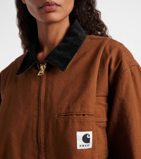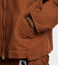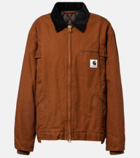 Seeking to create enduring utilitarian styles, Sacai joins forces with Carhatt to design this puffer jacket. The classic piece is crafted from pure cotton canvas with a corduroy collar, varying pockets, and a two-way zipped front. Product Details - Material: 100% cotton - Care instructions: dry clean - Made in Japan - Designer color name: D/Beige - Item color: brown - Material II: 80% cotton, 20% polyester - Material III: 55% polyester, 44% cotton, 1% polyurethane - Lining: 100% polyester - Lining II: 100% polyester - Hardware color: gold - Cuff: ribbed - Pockets: welt pockets, utility chest pocket, internal pocket - Closure: two-way zipped front - Item number: P01119823 Size & Fit - True to size - Designed for a loose fit - Non-stretchy fabric - Falls to the hip - The model seen in the picture is 178cm-5'10" and wearing a size 1