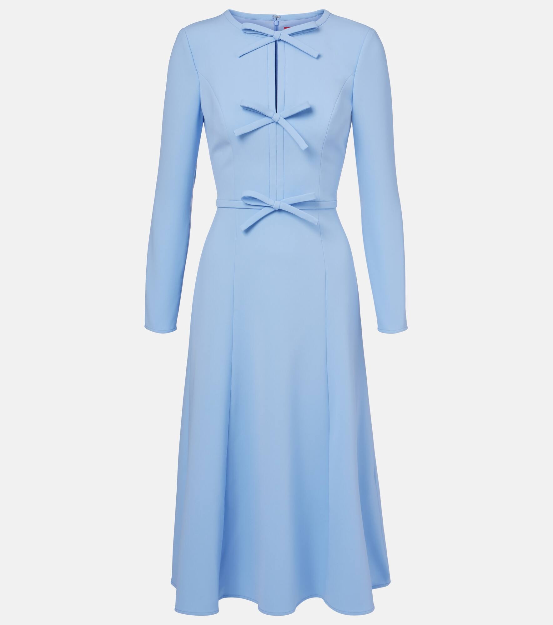 Crowned the best-dressed woman of all time, Carolina Herrera's namesake brand has a fashion prowess that reigns supreme. Crafted from fluid crepe, this midi dress is elegantly finished with delicate bow details. Product Details - Material: 92% polyester, 8% polyurethane - Care instructions: dry clean - Made in the USA - Designer color name: Sky Blue - Item color: blue - Lining: 99% polyester, 1% elastane - Closure: zipper, hook fastening - Item number: P01044796 Size & Fit - True to size - Cinched waist - Non-stretchy fabric - The model seen in the picture is 178cm-5'10" and wearing a size US 4