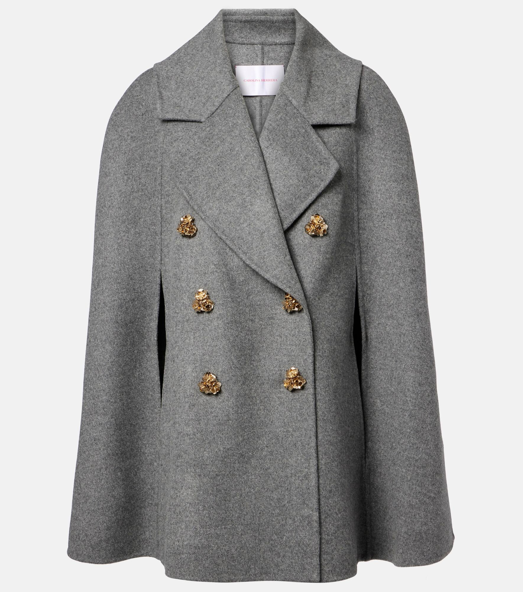 Carolina Herrera is celebrated for her elegant designs, exemplified by this cape. Crafted in Italy from melange virgin wool, the double-breasted piece features sophisticated gold-toned buttons, notched lapels, and slits for added allure. Product Details - Material: 100% virgin wool - Care instructions: dry clean - Made in Italy - Designer color name: Melange Grey - Item color: gray - Hardware color: gold - Lining: 100% polyester - Closure: double-breasted (six buttons) - Item number: P01091880 Size & Fit - True to size - Designed for a loose fit - Non-stretchy fabric - Falls below the hip - The model seen in the picture is 178cm-5'10" and wearing a size XS