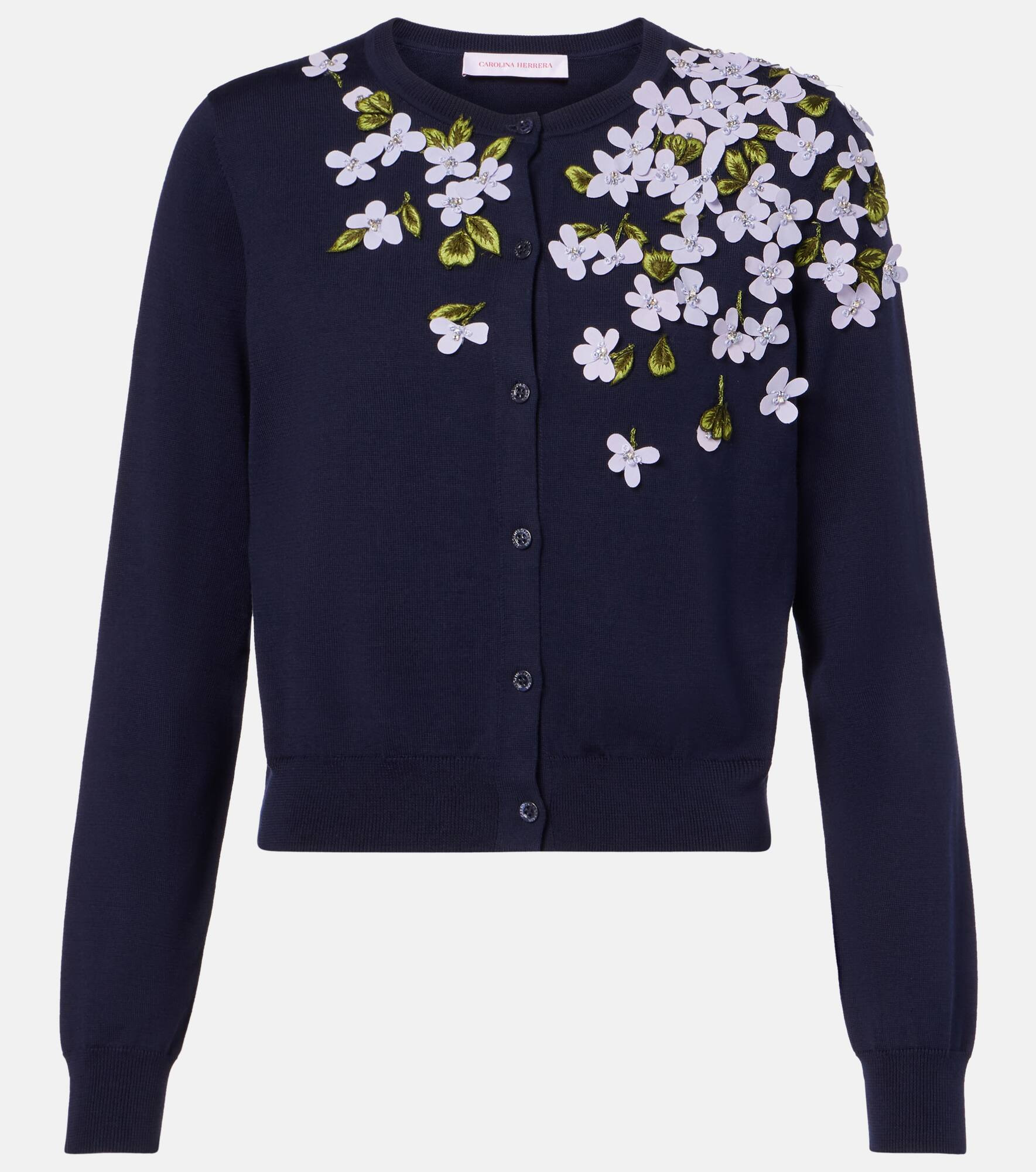 Crowned the best-dressed woman of all time, Carolina Herrera's namesake brand has a fashion prowess that reigns supreme. This silk and cotton cardigan showcases a delicate floral embroidery that adds a sophisticated touch to the ensemble. Product Details - Material: 55% silk, 45% cotton - Care instructions: dry clean - Made in China - Designer color name: Midnight - Item color: blue - Closure: buttoned front - Hem: ribbed - Cuff: ribbed - Item number: P01051545 Size & Fit - True to size - Straight fit - Stretchy fabric - Slightly cropped - The model seen in the picture is 178cm-5'10" and wearing a size XS