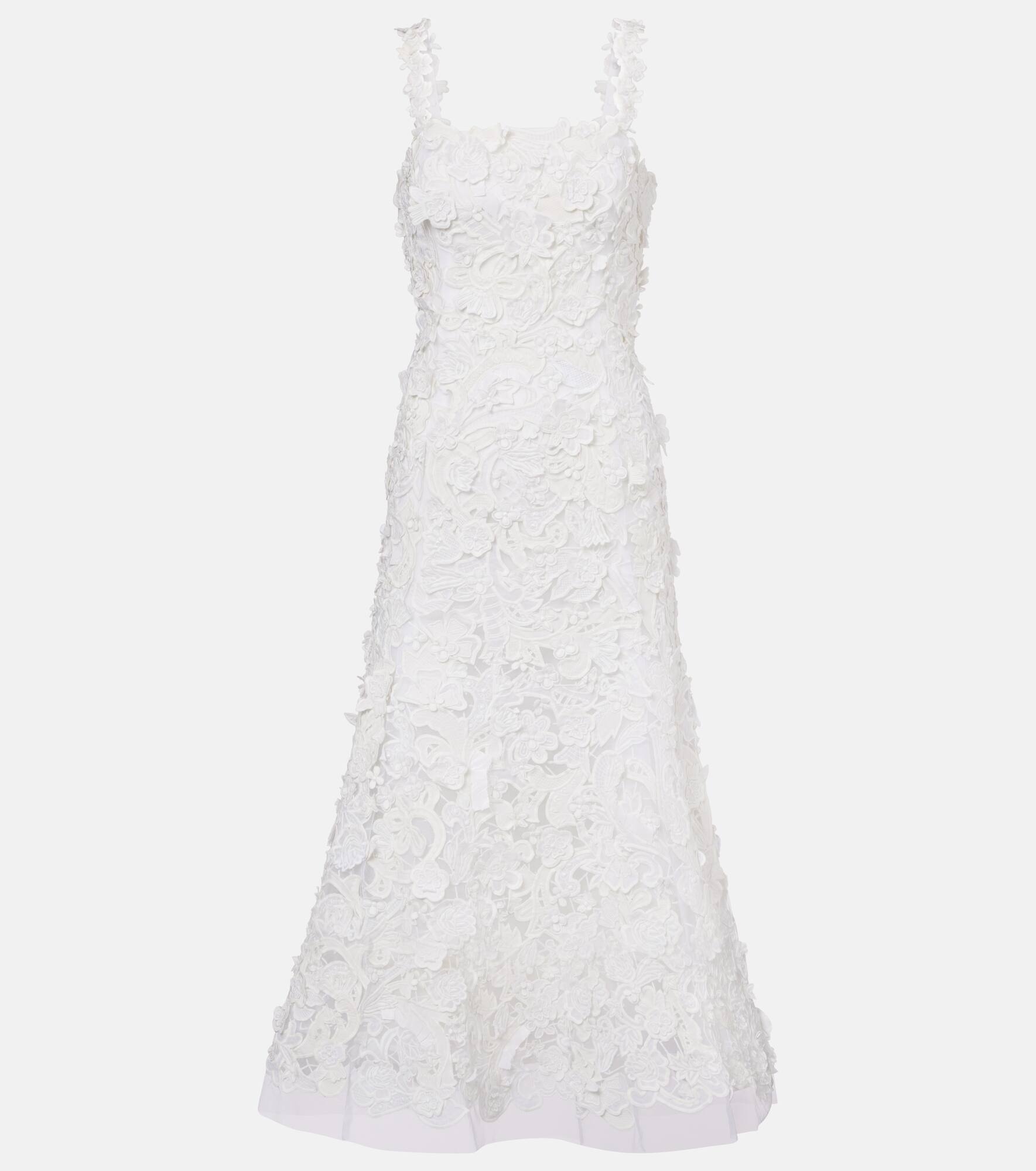 Rich texture abounds on this candid midi dress from Carolina Herrera. Elaborately created from guipure lace and silk-organza floral appliques, this unique design blurs the line between fashion and fine art. Product Details - Material: 100% nylon - Care instructions: dry clean - Made in the USA - Designer color name: Ivory - Item color: white - Closure: concealed zipper - Lining: 100% silk - Item number: P01023155 Size & Fit - True to size - Internal boned corset for support - Cinched waist - Non-stretchy fabric - The model seen in the picture is 178cm-5'10" and wearing a size US 4
