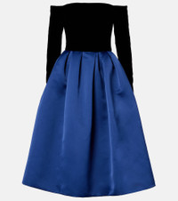 A permanent fixture on the red carpet, Carolina Herrera is credited with the most elegant eveningwear. This gown has an off-shoulder crepe top attached to a full satin skirt that arrives at a midi length. Product Details - Material: 100% polyester - Care instructions: dry clean - Made in the USA - Designer color name: Dark Navy Multi - Item color: blue, black - Material II: 65% rayon, 32% cupro, 3% polyurethane - Lining: 100% polyester - Closure: zipped back - Built-in bustier - Boning - Pockets: side slit pockets - Fully lined - Item number: P01091885 Size & Fit - True to size - Off-the-shoulder - Internal boned corset for support - Cinched waist - Non-stretchy fabric - The model seen in the picture is 178cm-5'10" and wearing a size US 4