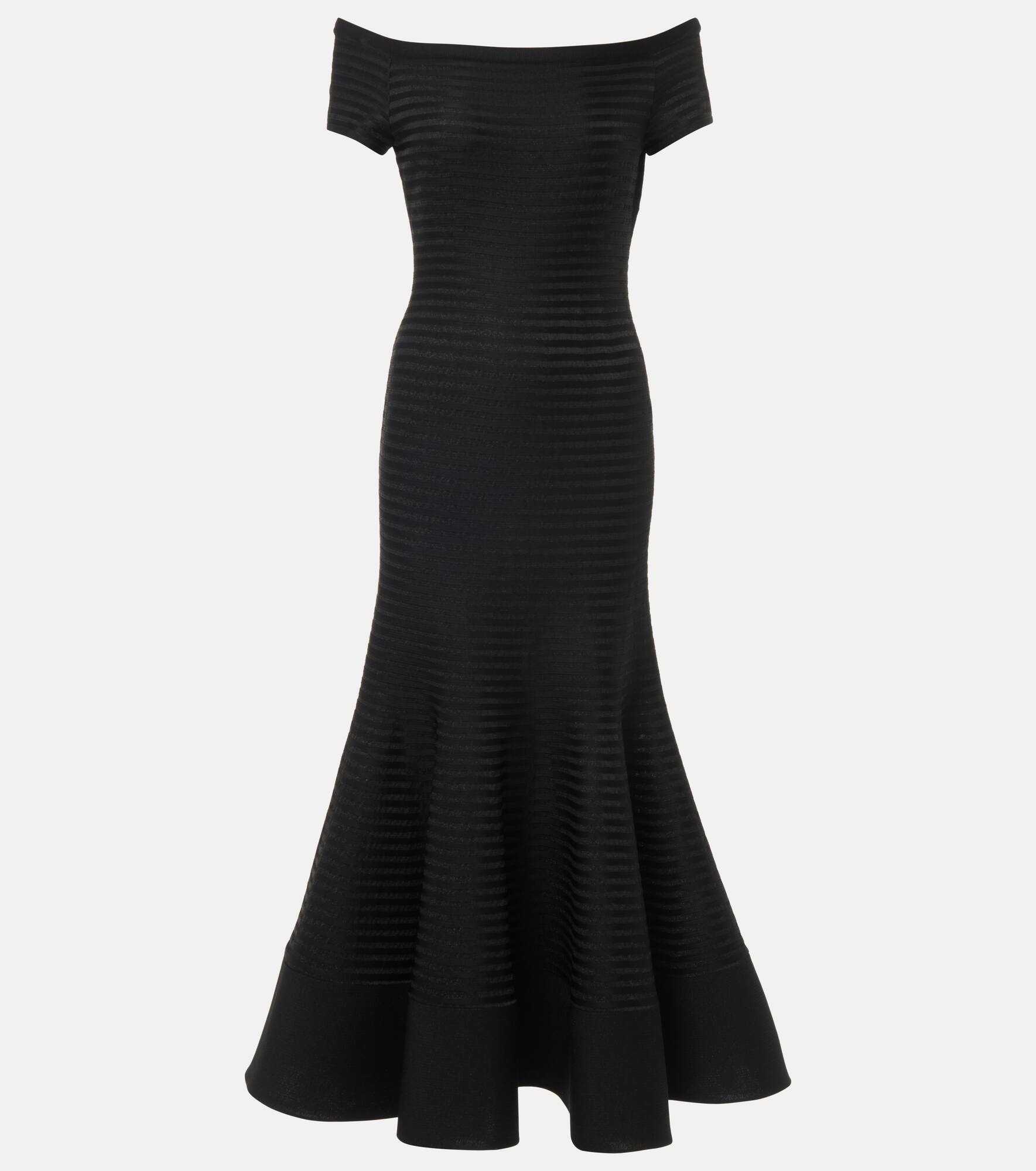 Off-the-shoulder Striped Metallic Knitted Midi Dress