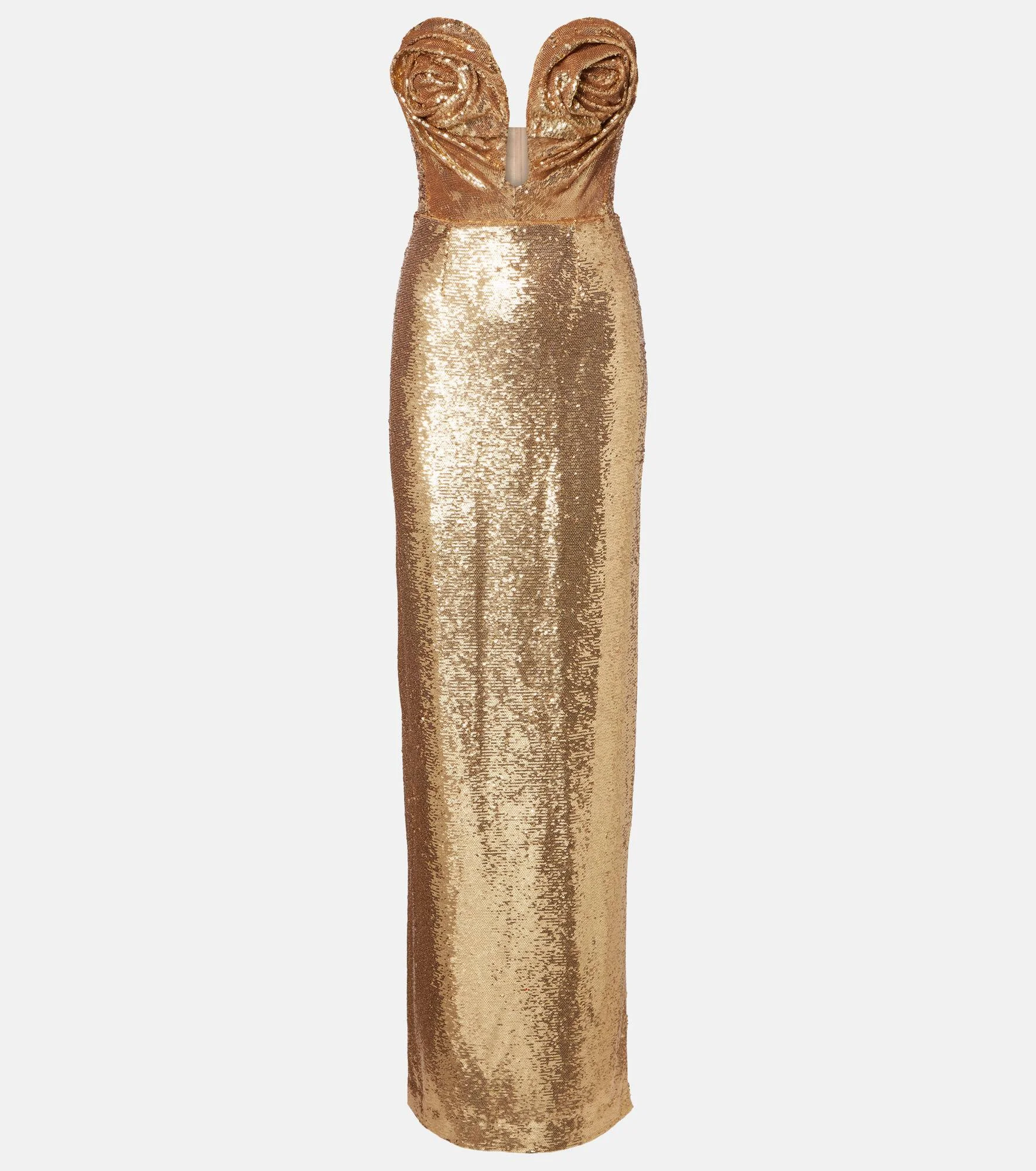 A permanent fixture on the red carpet, Carolina Herrera is credited with the most elegant eveningwear. This gown features boning for added structure and is adorned with all-over, gold-hued sequins for a dazzling statement. Product Details - Material: 100% polyester - Care instructions: dry clean - Made in the USA - Designer color name: Gold - Item color: gold - Material II: 100% silk - Lining: 100% polyester - Boning - Padded cups - Closure: zipped back - Long vent - Item number: P01103738 Size & Fit - True to size - Strapless - Internal boned corset for support - Fitted - Non-stretchy fabric - Padded top - The model seen in the picture is 178cm-5'10" and wearing a size US 4