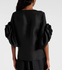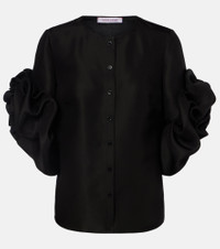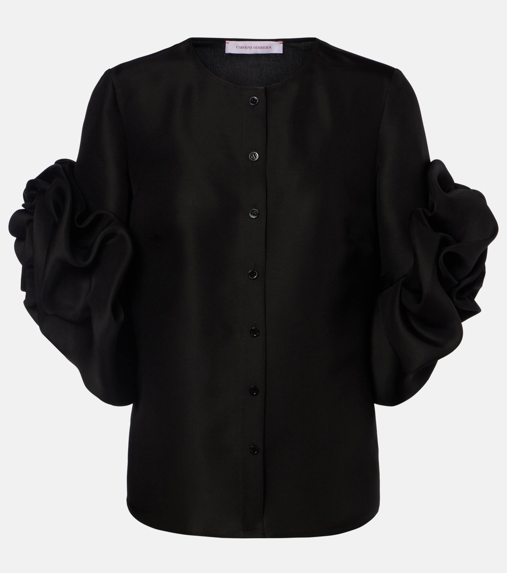 Crowned the best-dressed woman of all time, Carolina Herrera's namesake brand has a fashion prowess that reigns supreme. Made from pure silk, this top features a buttoned silhouette with elbow-length sleeves adorned with voluminous, rose-shaped detailing. Product Details - Material: 100% silk - Care instructions: dry clean - Made in the USA - Designer color name: Black - Item color: black - Closure: buttoned front - Item number: P01103740 Size & Fit - True to size - Straight fit - Non-stretchy fabric - Falls to the hip - The model seen in the picture is 178cm-5'10" and wearing a size US 4