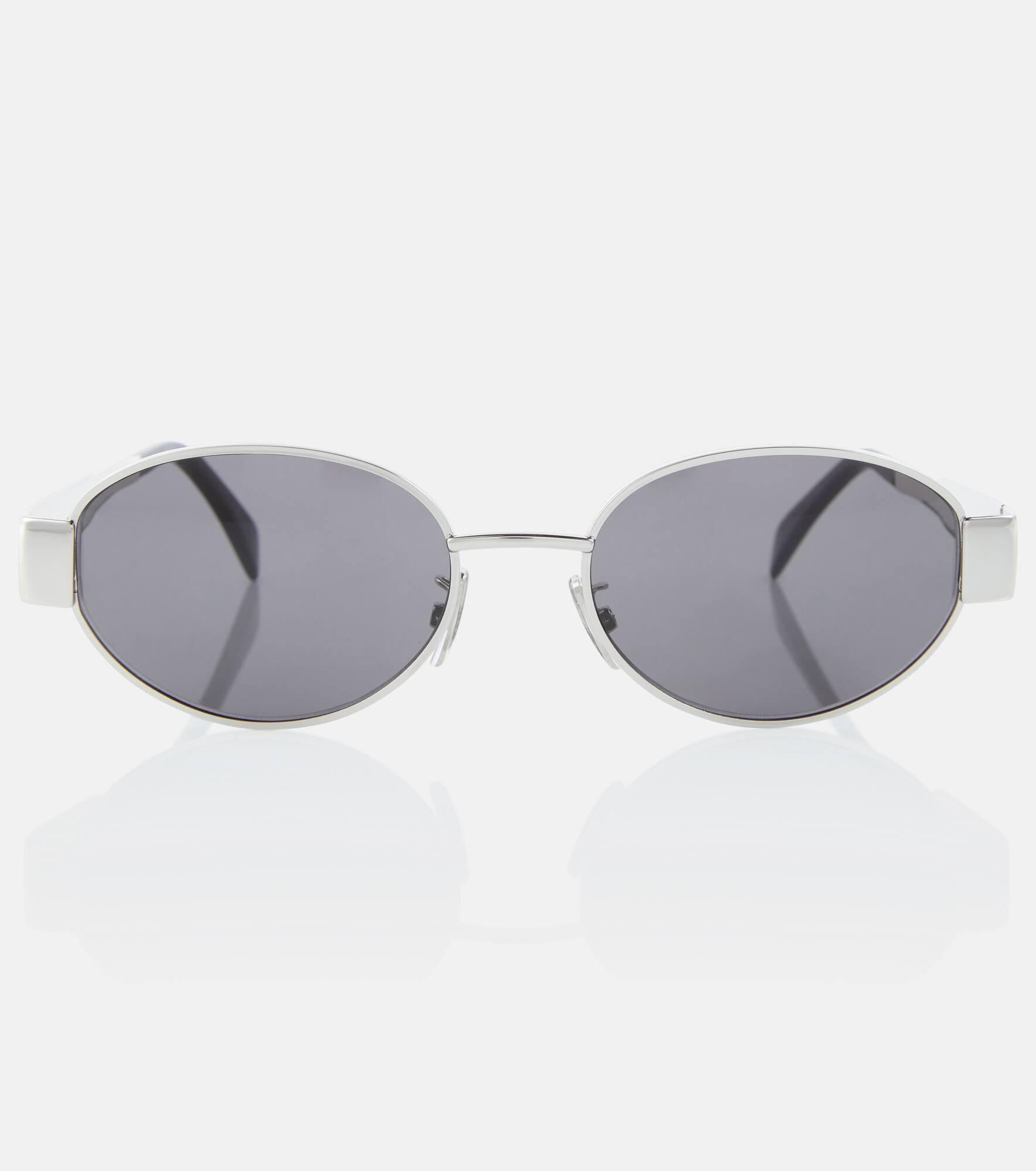 These sunglasses from Celine Eyewear have a futuristic silhouette that's designed in silver-tinted metal. The oval pair has Triomphe branding and tonal smoke gray lenses. Product Details - Frame color: silver - Frame material: metal - Lens color: grey - comes with cleaning cloth - comes in a logo-embossed case - comes with a presentation box - Lens filter category 3 - Made in Italy - Item number: P00679998 Size & Fit - Lens width: 54mm-2.15" - Bridge size: 18mm-0.7" - Earpiece length: 135mm-5.3" - Adjusted fit