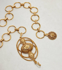 Renowned for its free-spirited aesthetic, Chloe's designs are characterized by romance with a Parisian flair. Crafted from brass, the Chloe Amulet chain belt will elevate any look with its intricately detailed buckle and pendant. Product Details - Material: 100% brass - Care instructions: do not wash - Made in Italy - Designer color name: Vintage Gold - Item color: gold - Closure: hook fastening - Includes: dust bag, box - Item number: P01039071 Size & Fit - Adjustable length - Length when open 104cm-41" - Width 2,5cm-1" - Buckle width 8cm-3"
