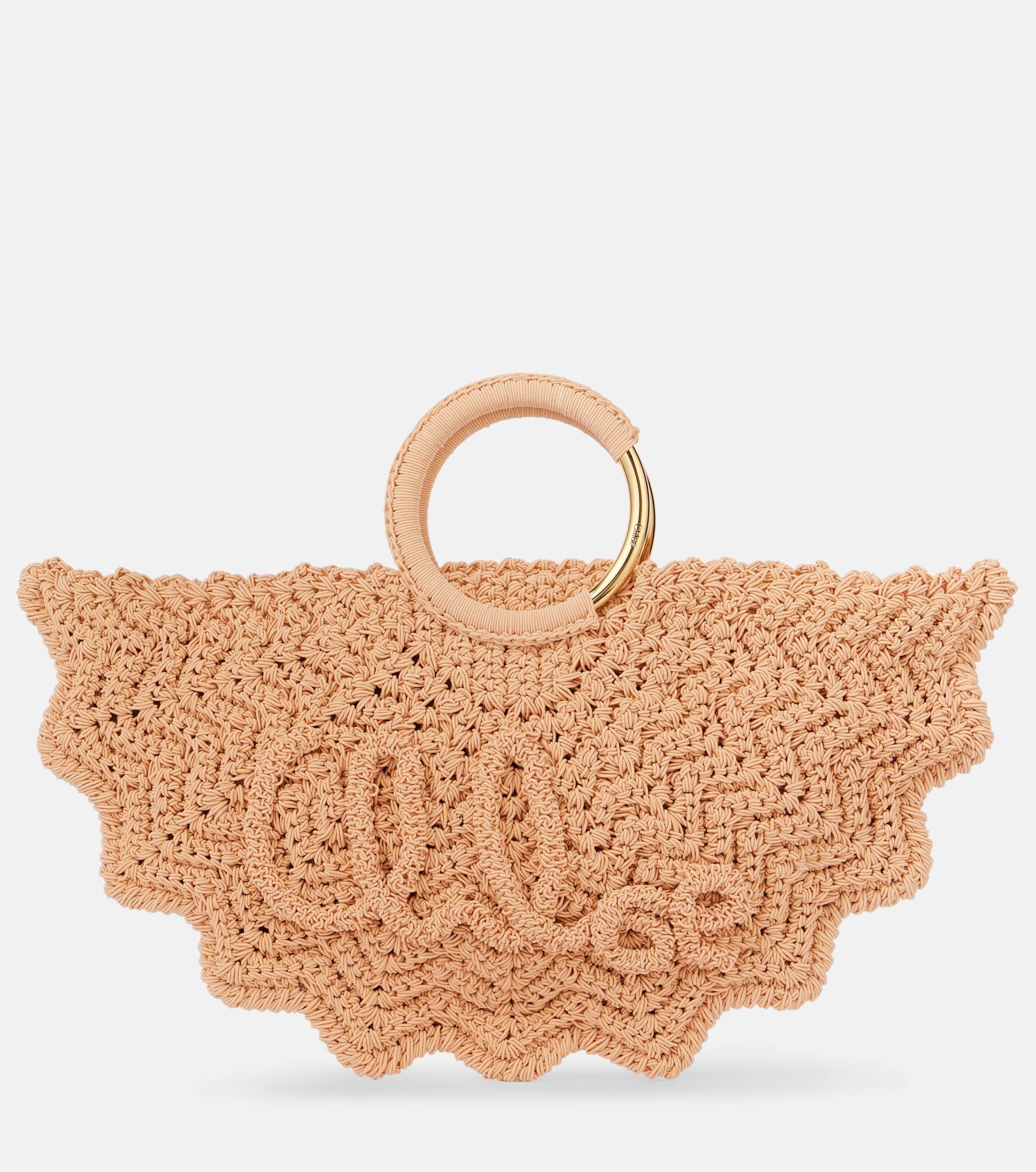 The Bracelet Paravent Small tote bag from Chloe boasts a crochet design and a chic scalloped silhouette. It's topped with a round, gold-tone handle and then detailed with subtle brand lettering. Product Details - Material: fabric - Lining: leather - Made in Albania - Designer color name: Apricot Pink 610 - Item color: pink - Top handles - Closure: magnetic fastening - Item number: P01016767 Size & Fit - Height 23cm-9" - Width 42cm-16.5" - Length of handles 22cm-8.5"