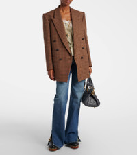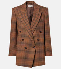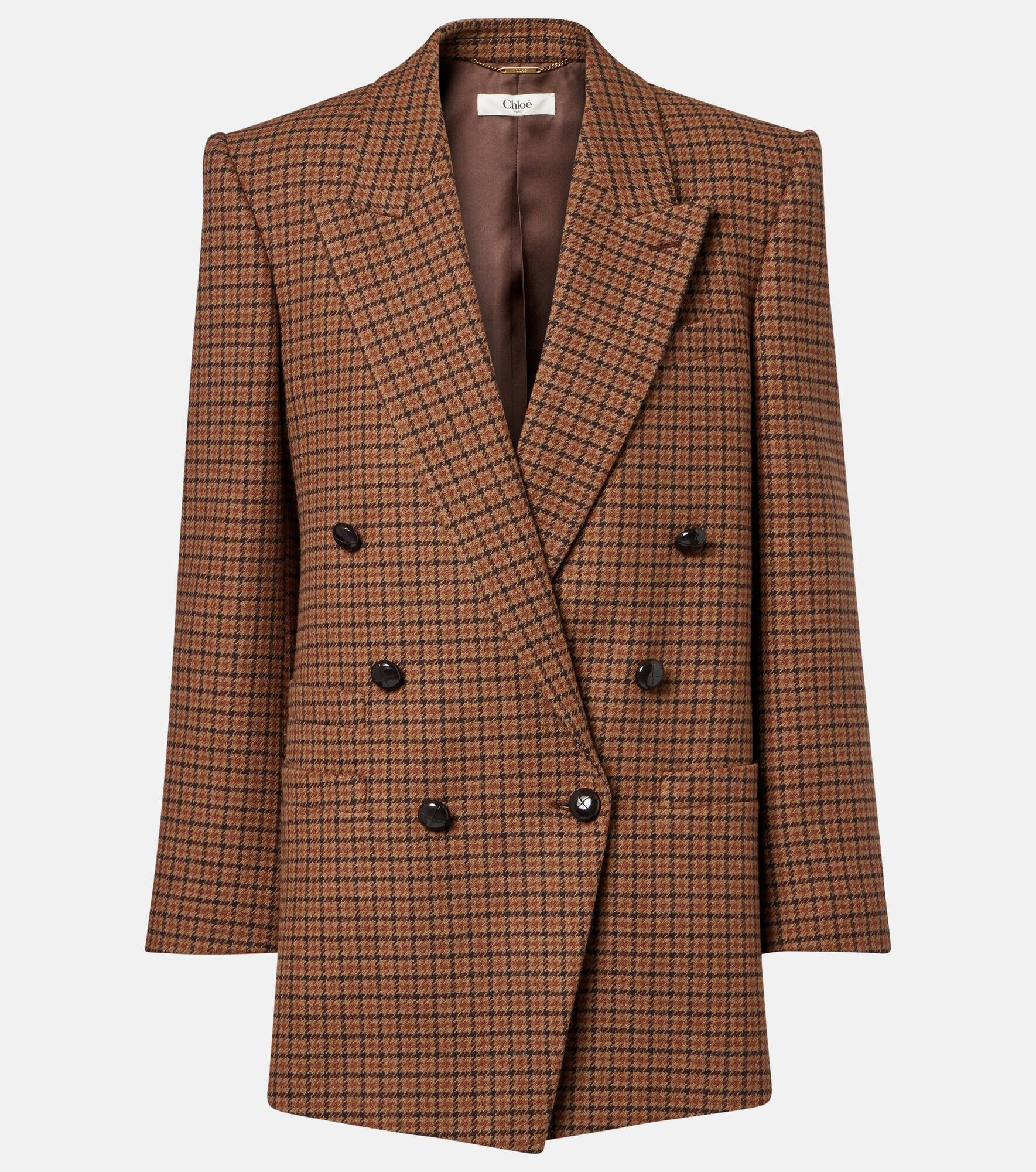 Renowned for its free-spirited aesthetic, Chloe's designs are characterized by romance with a Parisian flair. This double-breasted blazer is made in Italy from a wool blend and showcases a timeless checked motif. Product Details - Material: 85% wool, 15% polyamide - Care instructions: specialist clean - Made in Italy - Designer color name: Brown - Black 1 - Item color: brown - Lining: 100% silk - Details: 80% cow leather, 15% paper, 5% zamak - Contains non-textile parts of animal origin - Peak lapel - Closure: double-breasted (six buttons) - Pockets: internal pockets, welt pockets - Cuff: four buttons - Vent: double - Item number: P01089630 Size & Fit - True to size - Shoulder pad inserts - Straight fit - Non-stretchy fabric - Falls below the hip - Height of model is 175cm-69" and wears a size FR 36