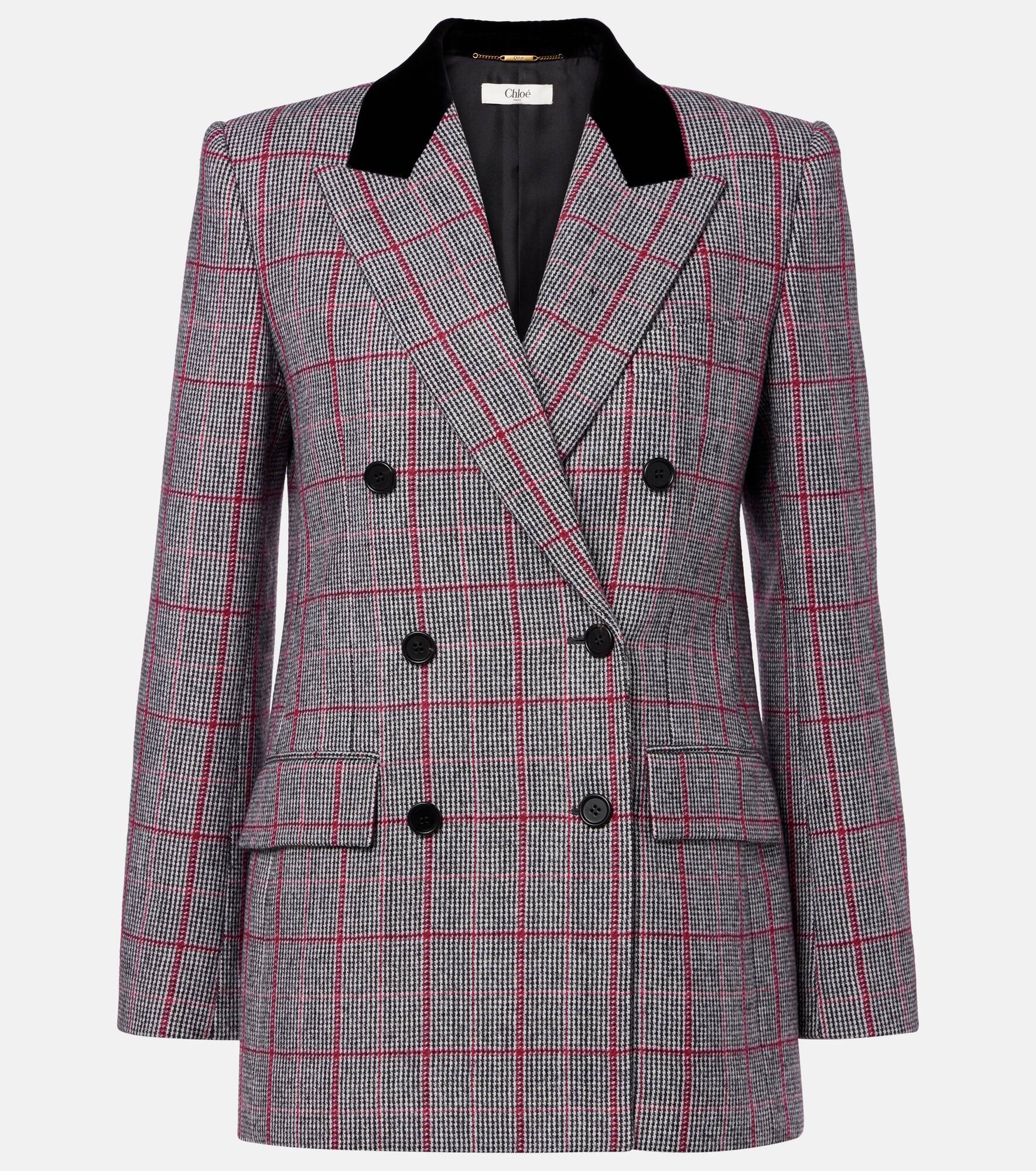 This double-breasted wool jacket from Chloe features an evergreen checked pattern and a tailored silhouette for a sophisticated look. Shaped with padded shoulders, its design is complete with a velvet collar and two flap pockets. Product Details - Material: 100% wool - Care instructions: dry clean - Made in Italy - Designer color name: Black - White 1 - Item color: black, white, burgundy - Trim: 100% cotton - Lining: 100% silk - Contains non-textile parts of animal origin - Peak lapel - Closure: double-breasted (six buttons) - Pockets: internal pockets, flap pockets - Cuff: four buttons - Item number: P01067909 Size & Fit - True to size - Shoulder pad inserts - Straight fit - Non-stretchy fabric - Falls below the hip - The model seen in the picture is 178cm-5'10" and wearing a size FR 36