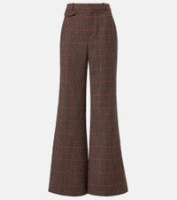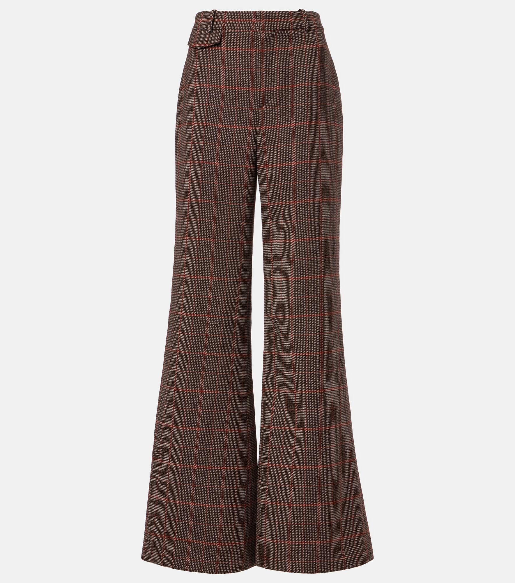 Renowned for its free-spirited aesthetic, Chloe's designs are characterized by romance with a Parisian flair. These high-rise flared pants are crafted from wool and feature a checked motif and small flap pockets at the hips. Product Details - Material: 100% virgin wool - Care instructions: dry clean - Made in Slovakia - Designer color name: Brown - Beige 1 - Item color: brown - Lining: 100% silk - Details: 100% water-buffalo horn - Contains non-textile parts of animal origin - Closure: zipper fly, button and hook fastenings - Pockets: back pockets - Belt loops - Item number: P01067893 Size & Fit - True to size - Non-stretchy fabric - Flared - High-waisted - Height of model is 175cm-69" and wears a size FR 36