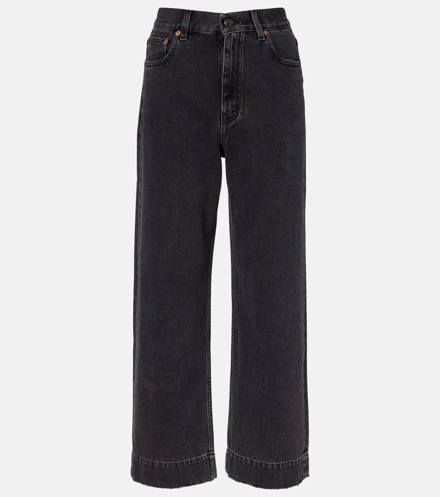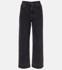 Renowned for its free-spirited aesthetic, Chloe's designs are characterized by romance with a Parisian flair. These wide-leg jeans feature a cropped silhouette with a high-rise waistline. Product Details - Material: 100% cotton - Care instructions: machine wash at 30 degrees - Made in Italy - Designer color name: Asphalt Black - Item color: black - Trim: 100% calf leather - Contains non-textile parts of animal origin - Closure: zipper fly, button fastening - Belt loops - Pockets: five pockets - Item number: P01130763 Size & Fit - Fits large to size - we recommend trying one size smaller - Non-stretchy fabric - Slim-leg - Mid-rise - The model seen in the picture is 178cm-5'10" and wearing a size 26