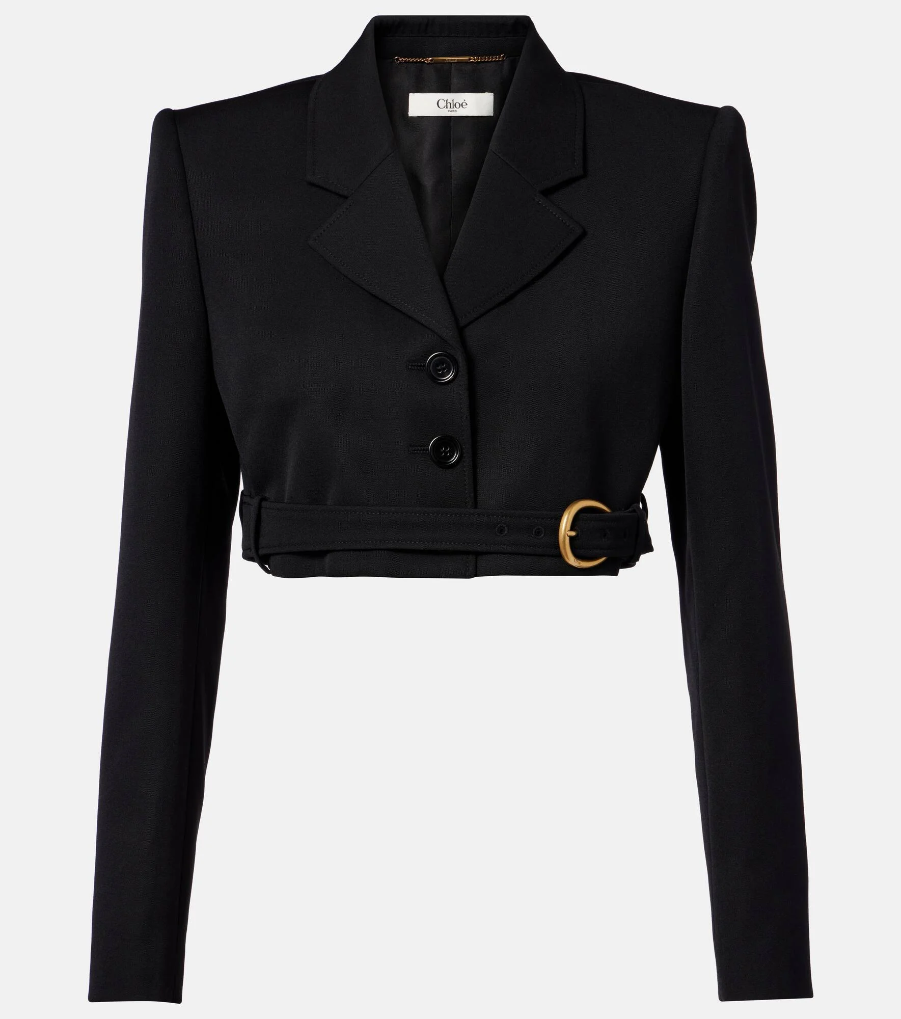 Renowned for its free-spirited aesthetic, Chloe's designs are characterized by romance with a Parisian flair. This cropped blazer is inspired by the classic Spencer jacket, crafted from virgin wool grain de poudre and fitted with a tonal belt at the hem. Product Details - Material: 100% virgin wool - Care instructions: dry clean - Made in Italy - Color: black - Designer color name: Black - Lining: 100% silk - Contains non-textile parts of animal origin - Closure: buttoned front - Item number: P01130678 Size & Fit - True to size - Shoulder pad inserts - Cinched waist - Adjustable hem - Non-stretchy fabric - Cropped - The model seen in the picture is 178cm-5'10" and wearing a size FR 36