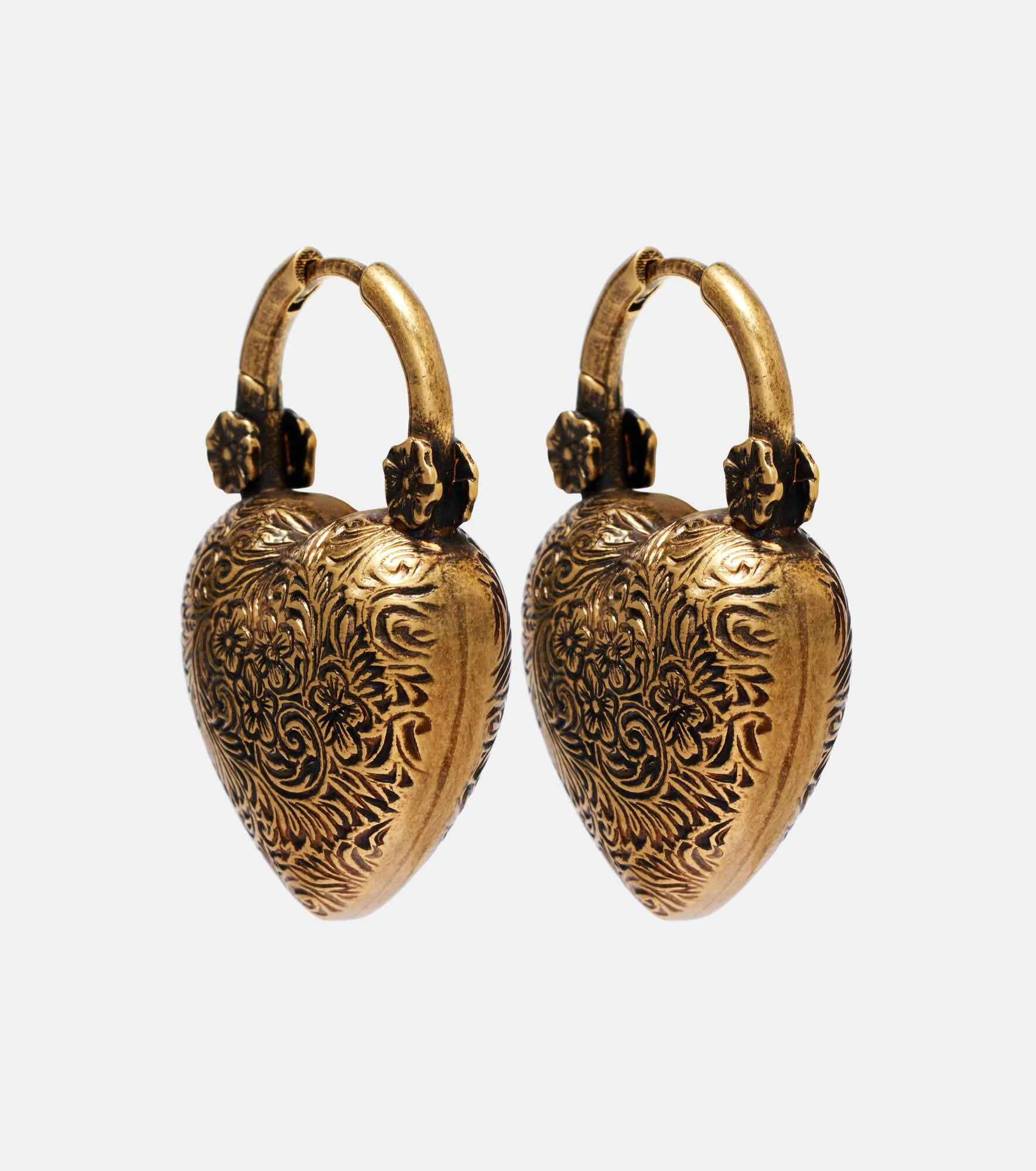 Chloe is renowned for its Parisian charm, offering refined collections that are destined to be timeless. These heart-shaped earrings elevate any look with their vintage finish and engraved floral motif on the chunky silhouette. Product Details - Material: brass - Made in Italy - Item color: gold - Designer color name: Vintage Gold - Item number: P01085870 Size & Fit - Length 4cm-1.5" - Max. width 2.3cm-1"