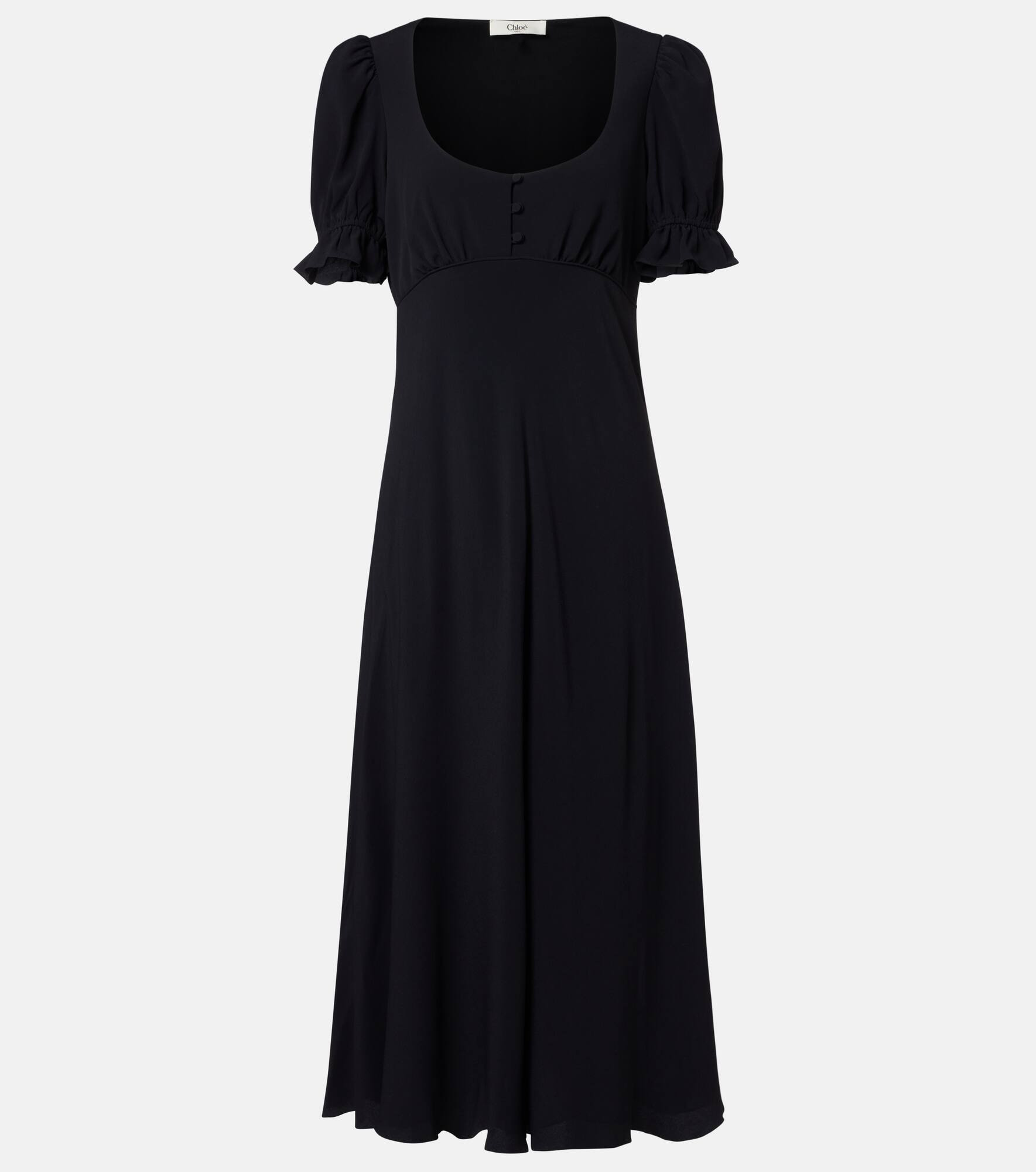 Renowned for its free-spirited aesthetic, Chloe's designs are characterized by romance with a Parisian flair. This midi dress features a gathered design at the waist, puff sleeves and a flared skirt. Product Details - Material: 60% acetate, 40% silk - Care instructions: dry clean - Made in Italy - Designer color name: Black - Item color: black - Lining: 68% acetate, 32% silk - Closure: partially buttoned front - Elasticated sleeves - Hem: uneven - Item number: P01067931 Size & Fit - Fits large to size - we recommend trying one size smaller - Cinched waist - Non-stretchy fabric - The model seen in the picture is 178cm-5'10" and wearing a size FR 34