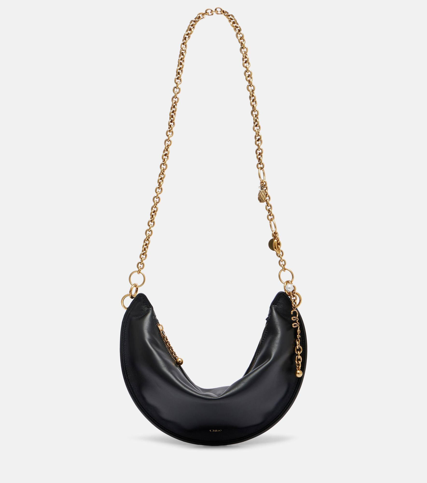 Renowned for its free-spirited aesthetic, Chloe's designs are characterized by romance with a Parisian flair. The Icons Small shoulder bag is cut from leather to a rounded silhouette and finished with a golden logo-detailed chain. Product Details - Material: calf leather - Lining: calf leather - Made in Italy - Designer color name: Black - Item color: black - Detachable chain shoulder strap - Closure: zipped top - Hardware color: gold - Item number: P01039045 Size & Fit - Max. height 18cm-7" - Max. width 40cm-15.5" - Chain length 92cm-36" - Pendant length 14,5cm-5.5" - Pendant width 2cm-1"