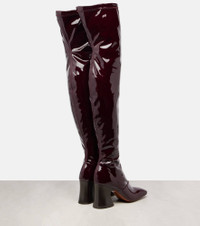 The Janis over-the-knee boots from Chloe bring an urban aesthetic for your favorite night looks. Crafted in Italy from rubber with a leather trim, this pair flaunts 80 mm flared heels and a square toe. Product Details - Upper: rubber - Lining: leather - Sole: leather insole and sole - Toe shape: square toe - Made in Italy - Includes: dust bag - Designer color name: Obscure Red - Item color: burgundy - Trim: leather - Hardware color: gold - Closure: zipped side - Item number: P01041443 Size & Fit - True to size - Slightly narrow at the back - European sizes - 8cm-3" heel (size EU 38) - 63cm-25" shaft height (size EU 38) - 37cm-14.5" shaft width (size EU 38) - shaft width measured on largest part of boot