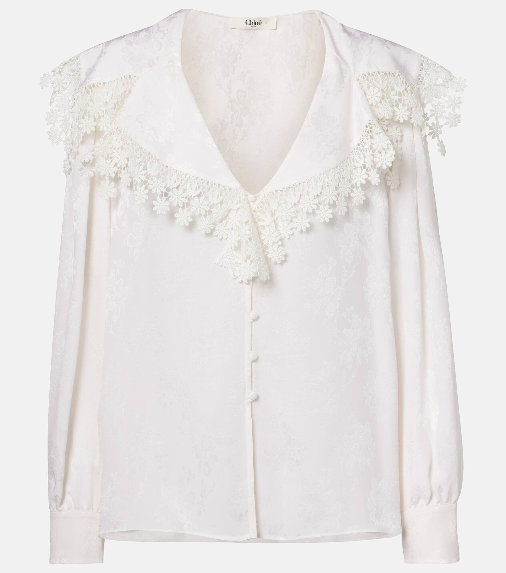 Chloe's designs are characterized by romance with a Parisian flair. This blouse is made from pure silk and features a floral jacquard design as well as lace trims and covered buttons at the side. Product Details - Material: 100% silk - Care instructions: dry clean - Made in Italy - Designer color name: Iconic Milk - Item color: white - Trim: 80% cotton, 20% polyester - Closure: buttoned front - Cuff: one button - Item number: P01089542 Size & Fit - True to size - Straight fit - Non-stretchy fabric - Falls below the hip - The model seen in the picture is 178cm-5'10" and wearing a size FR 36
