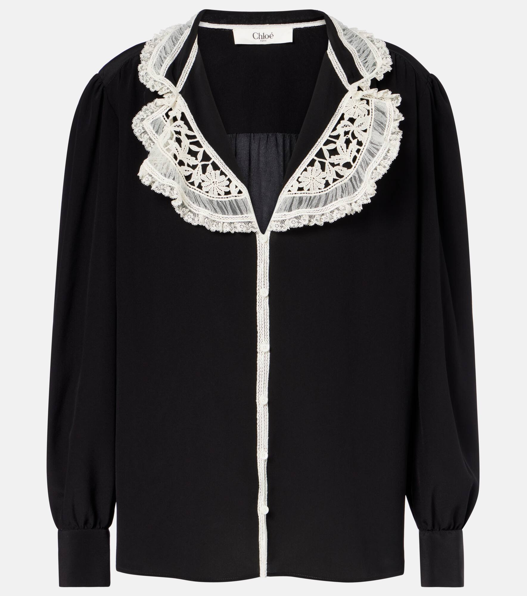 This blouse from Chloe is crafted from silk crepe de chine and showcases lace-trimmed detailing all along the notched lapels. The design is finished with buttoned cuffs and ruched details at the shoulders. Product Details - Material: 100% silk - Care instructions: dry clean - Made in France - Designer color name: Black - Item color: black, white - Trim: 100% polyester - Insert: 100% polyamide - Interlining: 90% cotton, 10% polyamide - Details: 100% mother-of-pearl - Contains non-textile parts of animal origin - Notched lapel - Closure: buttoned front - Cuff: buttoned - Item number: P01067924 Size & Fit - True to size - Dropped shoulders - Designed for a loose fit - Non-stretchy fabric - Falls below the hip - The model seen in the picture is 178cm-5'10" and wearing a size FR 36