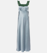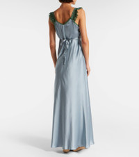 Chloe's designs are characterized by romance with a Parisian flair. This maxi dress is made from washed silk satin with gathered detailing at the bodice topped with contrast lace trims and finished with ribbon-tie fastening at the back. Product Details - Material: 100% silk - Care instructions: dry clean - Made in Italy - Designer color name: Ash Blue - Item color: blue, green - Trim: 90% cotton, 10% polyamide - Closure: button fastening - Self-tie back - Item number: P01089556 Size & Fit - True to size - Designed for a loose fit - Non-stretchy fabric - The model seen in the picture is 178cm-5'10" and wearing a size FR 36