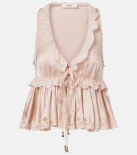 This top from Chloe showcases the house’s signature soft color palette. Made from washed silk satin, this piece has a flowy silhouette featuring lace trims and self-ties. Product Details - Material: 100% silk - Care instructions: dry clean - Made in Madagascar - Color: pink - Designer color name: Rose Dust - Item color: pink - Lining: 76% acetate, 24% silk - Trim: 90% cotton, 10% polyamide - Details: 80% cotton, 20% polyamide - Closure: self-ties - Item number: P01090113 Size & Fit - True to size - Designed for a loose fit - Adjustable at the waist - Non-stretchy fabric - Slightly cropped - Height of model is 178cm-70" and wears a size FR 36