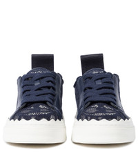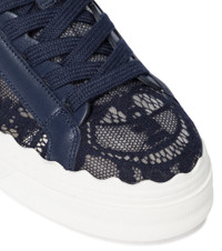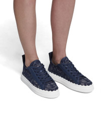 Chloé updates its Lauren sneakers in intricate, logo-adorned lace for an ultra-feminine finish. With scalloped trim running around the elevated soles and a high-contrast logo print at the pull tabs, this navy pair taps into the brand's bohemian styling, while maintaining a coveted sports-luxe look. Product Details - Upper: fabric - Lining: fabric - Sole: leather insole, rubber sole - Toe shape: round toe - Made in Vietnam - Includes: shoe box - Designer color name: Blue Lagoon - Closure: lace-up - Trim: leather - Item number: P00528128 Size & Fit - True to size - Half sizes please take the next size down - European sizes - 2,5cm-1" platform (size EU 38) - 3cm-1" wedge heel (size EU 38)