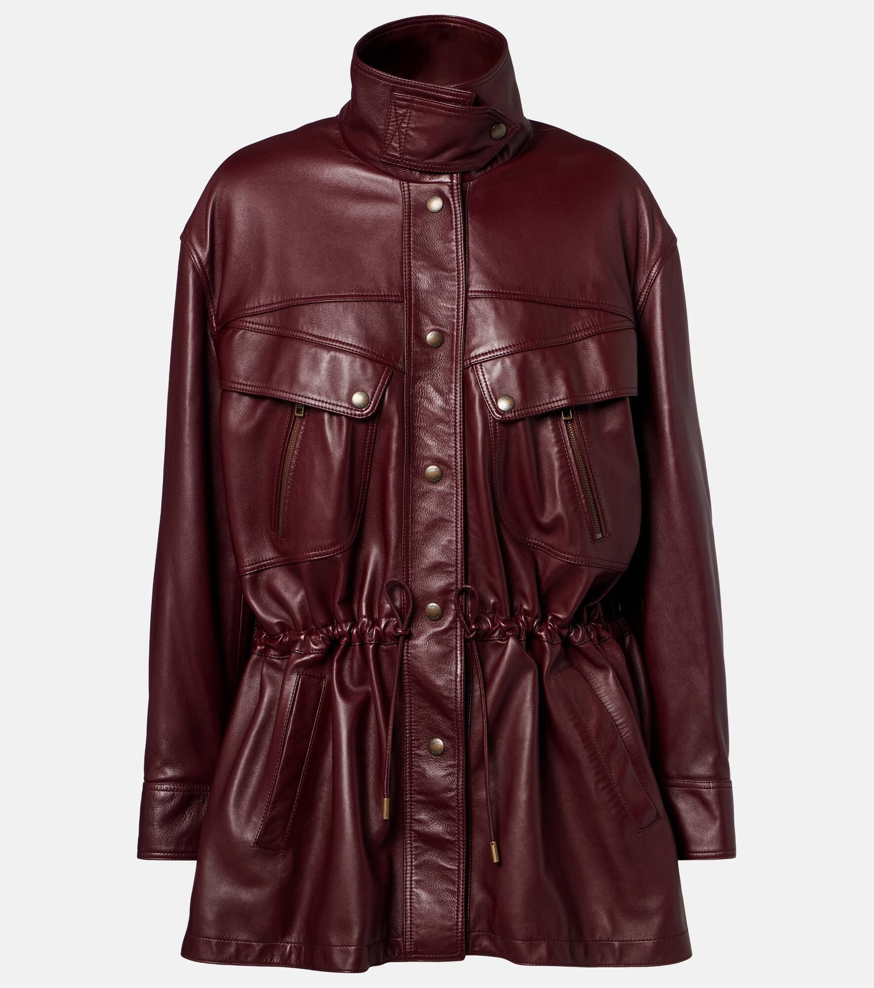 Renowned for its free-spirited aesthetic, Chloe's designs are characterized by romance with a Parisian flair. This leather jacket features a high-neck silhouette, oversized pockets, an elastic drawstring waist, and gold-toned snap closures. Product Details - Material: 100% lamb leather - Care instructions: specialist clean - Made in Italy - Designer color name: Dusky Brown - Item color: burgundy - Hardware color: antique gold - Lining: 62% viscose, 38% cotton - Pocket lining: 100% cotton - Closure: snap-buttoned front - Pockets: flap chest pockets, welt pockets, internal pocket - Drawstring waist - Cuff: buttoned - Fully lined - Item number: P01067860 Size & Fit - True to size - Dropped shoulders - Loose fit, drawstring waist - Adjustable at the waist - Non-stretchy fabric - Falls below the hip - The model seen in the picture is 178cm-5'10" and wearing a size FR 36